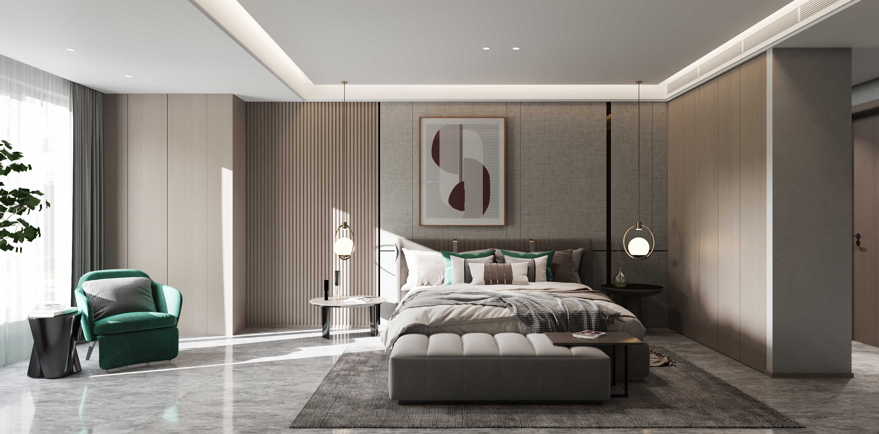 臥室與主基調(diào)相呼應,加入綠色的點綴,讓整個空間充滿生機不會顯得壓抑。