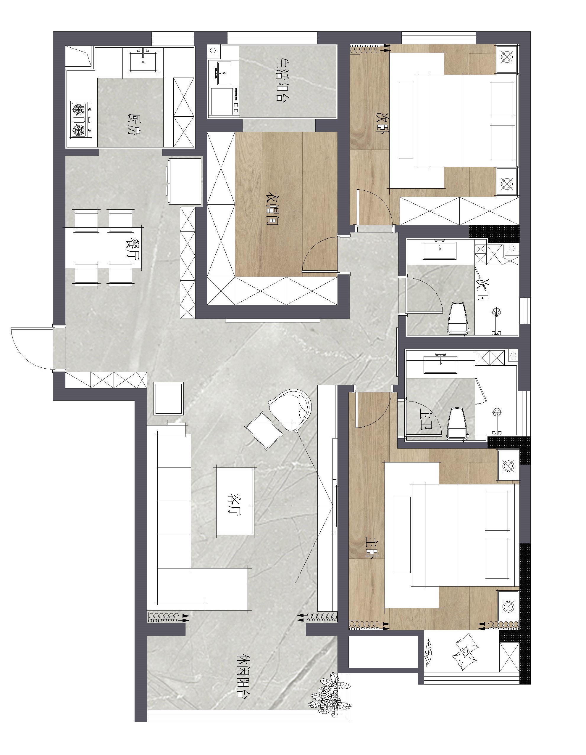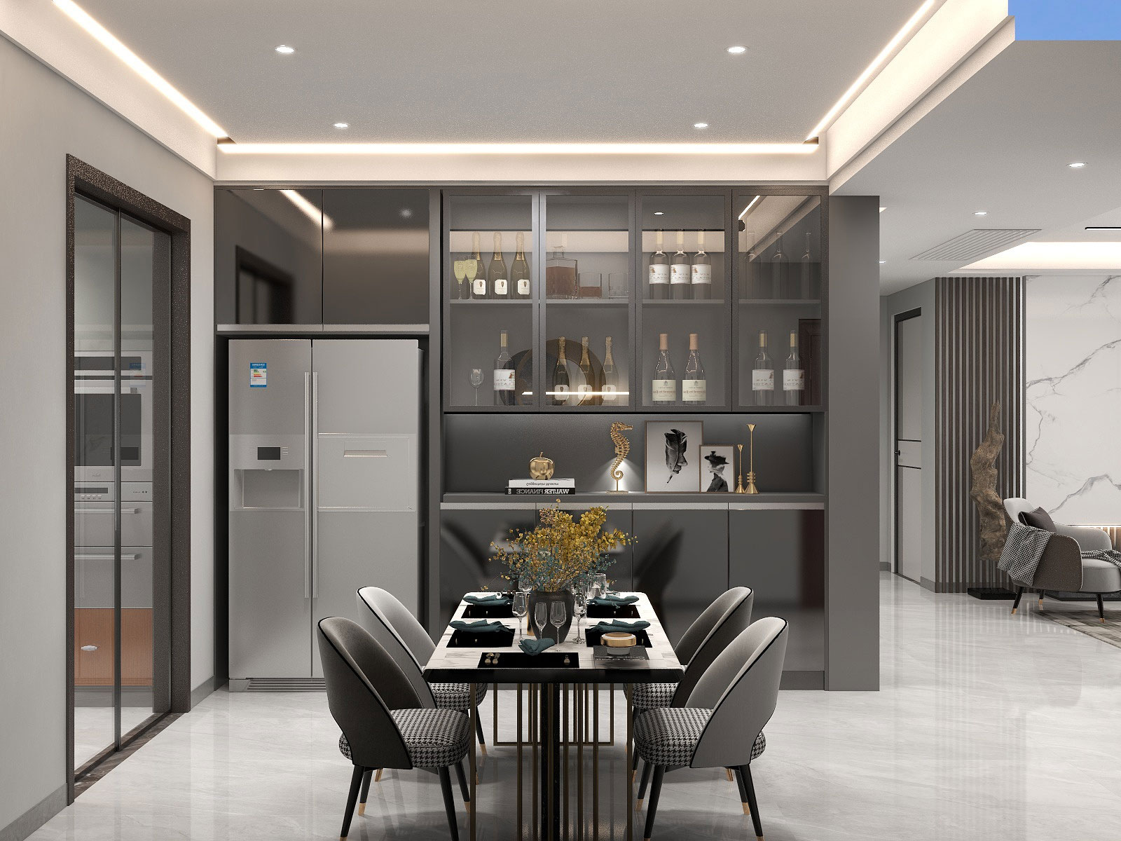 本案特點(diǎn):整個(gè)設(shè)計(jì)融合中西文化與現(xiàn)代審美,既有中式的莊重韻味,又有現(xiàn)代的優(yōu)美大方。石材、金屬線條的運(yùn)用,整體空間感更加豐富。