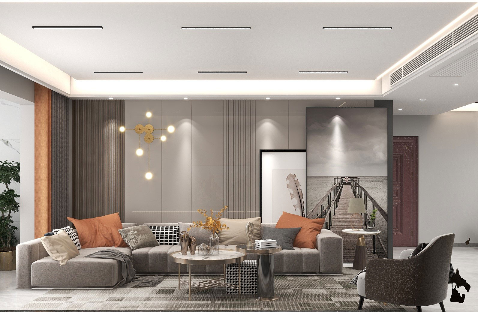 灰色系家具搭配愛馬仕橙和千鳥格紋,不同顏色的搭配,增加輕松的生活氣息。