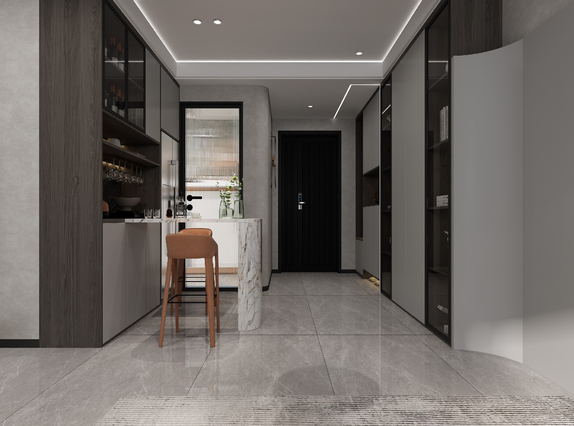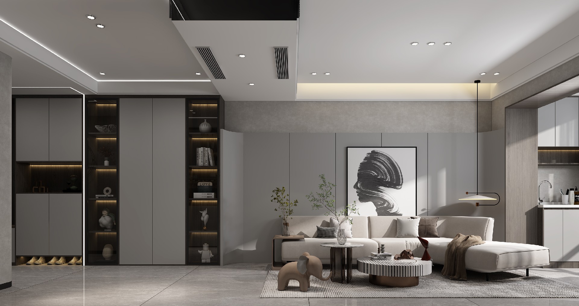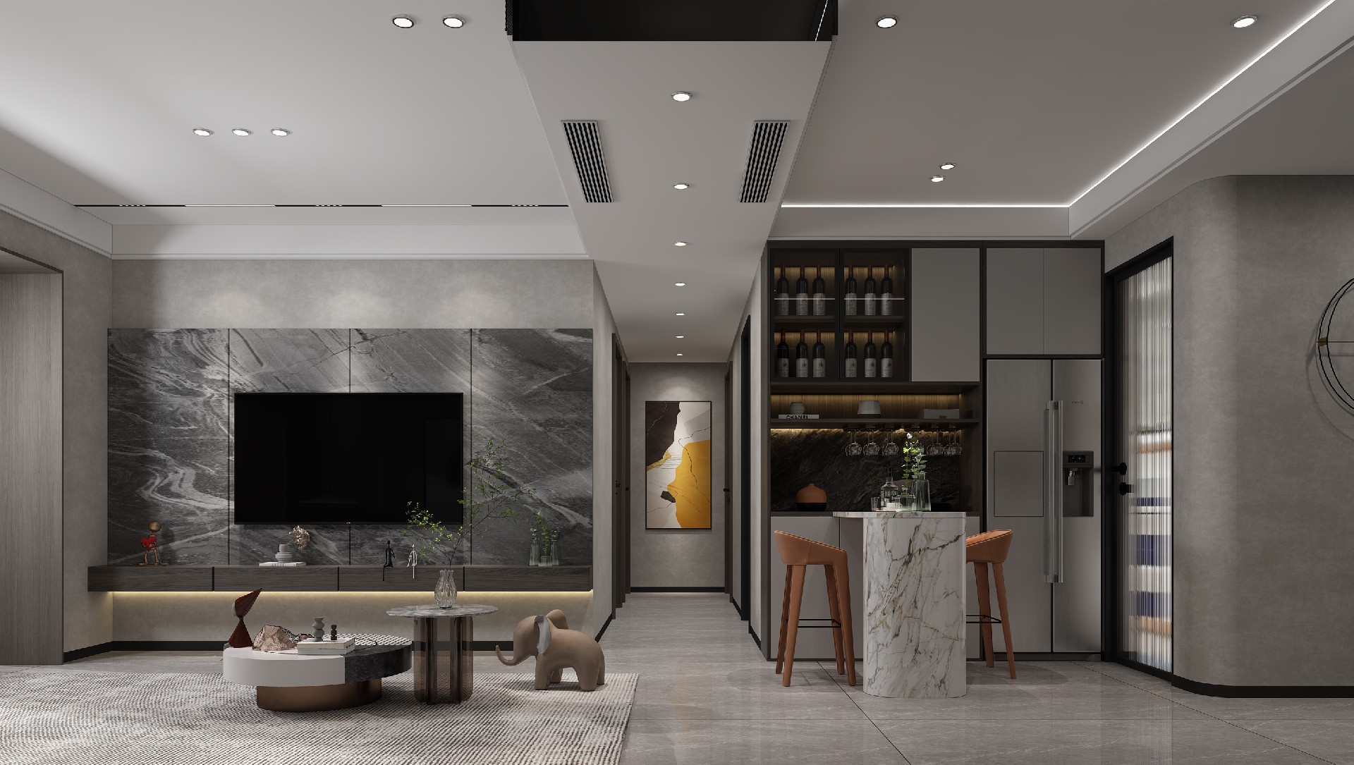 本案特點(diǎn):家作為喘息之地,規(guī)避華麗的外表,與簡約質(zhì)樸不期而遇。本案以現(xiàn)代手法做空間注解,黑灰色作為主旋律,無主燈設(shè)計(jì)拉高視覺縱深感,讓整個(gè)空間更加連貫。