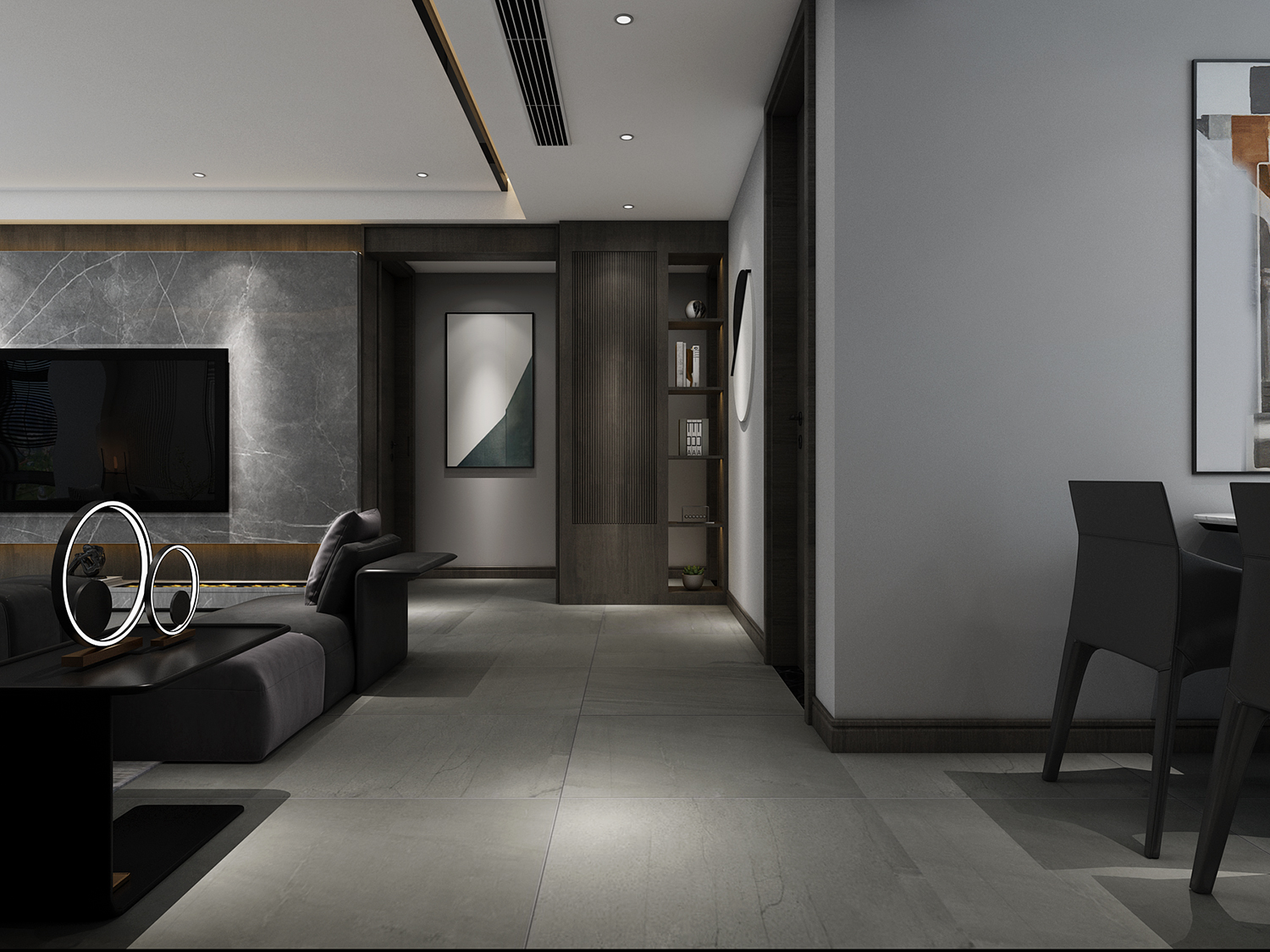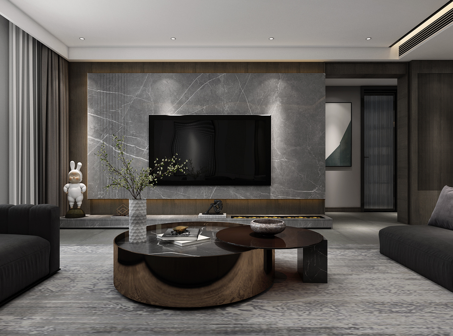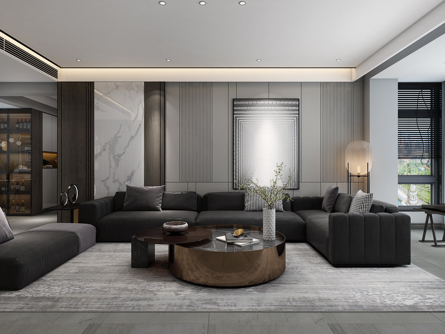 本案特點:利用灰色的布藝沙發(fā)搭配同色系毛絨地毯,奠定空間整體的沉穩(wěn)高級基調(diào)。