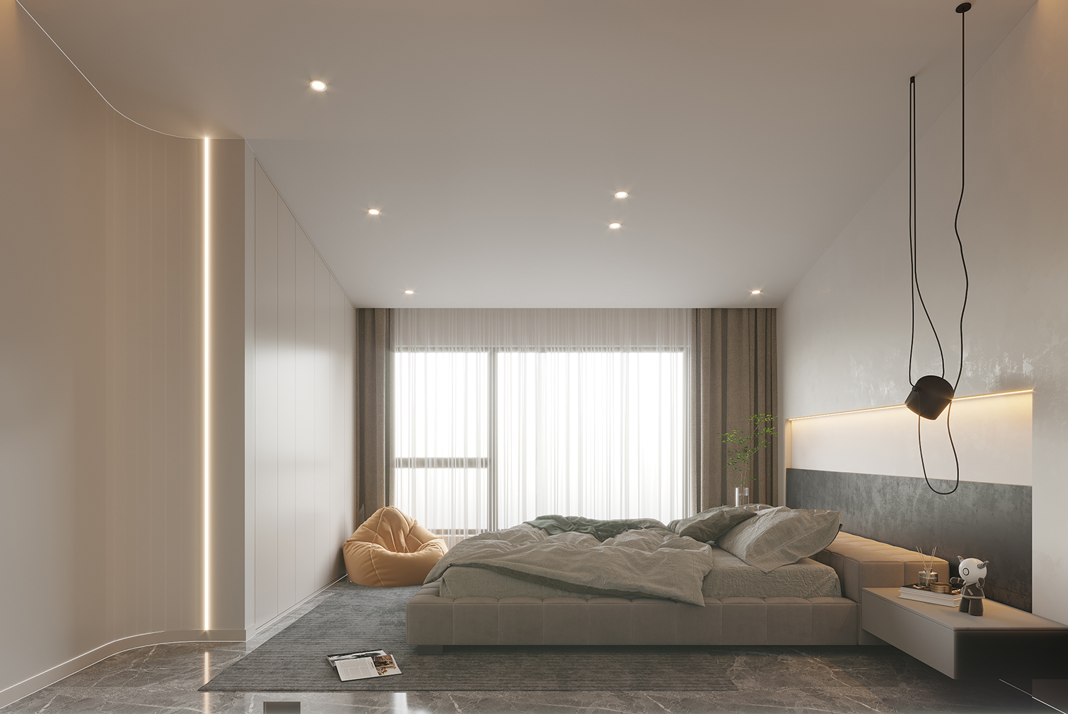 設(shè)計理念:客廳以灰色作為主色,黑白點(diǎn)綴其中,呼應(yīng)電視背景墻的爵士白大理石,張弛之間,盡顯包容大度之態(tài);落地氣泡燈活脫一個頑皮的精靈,平添幾分俏皮可愛氣;