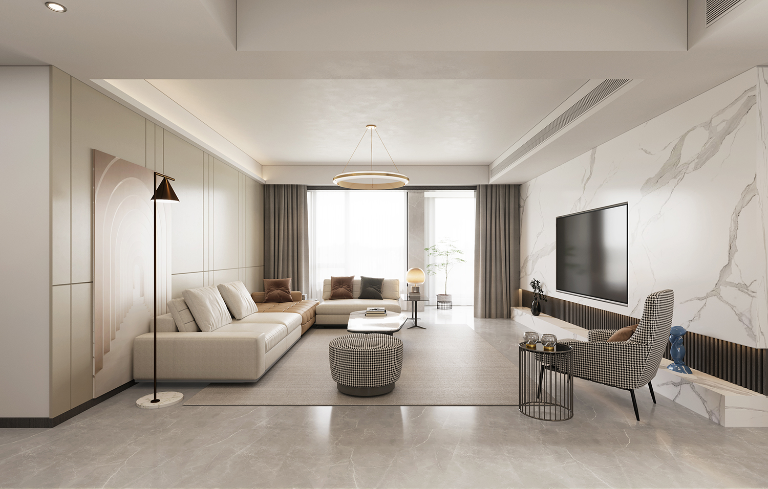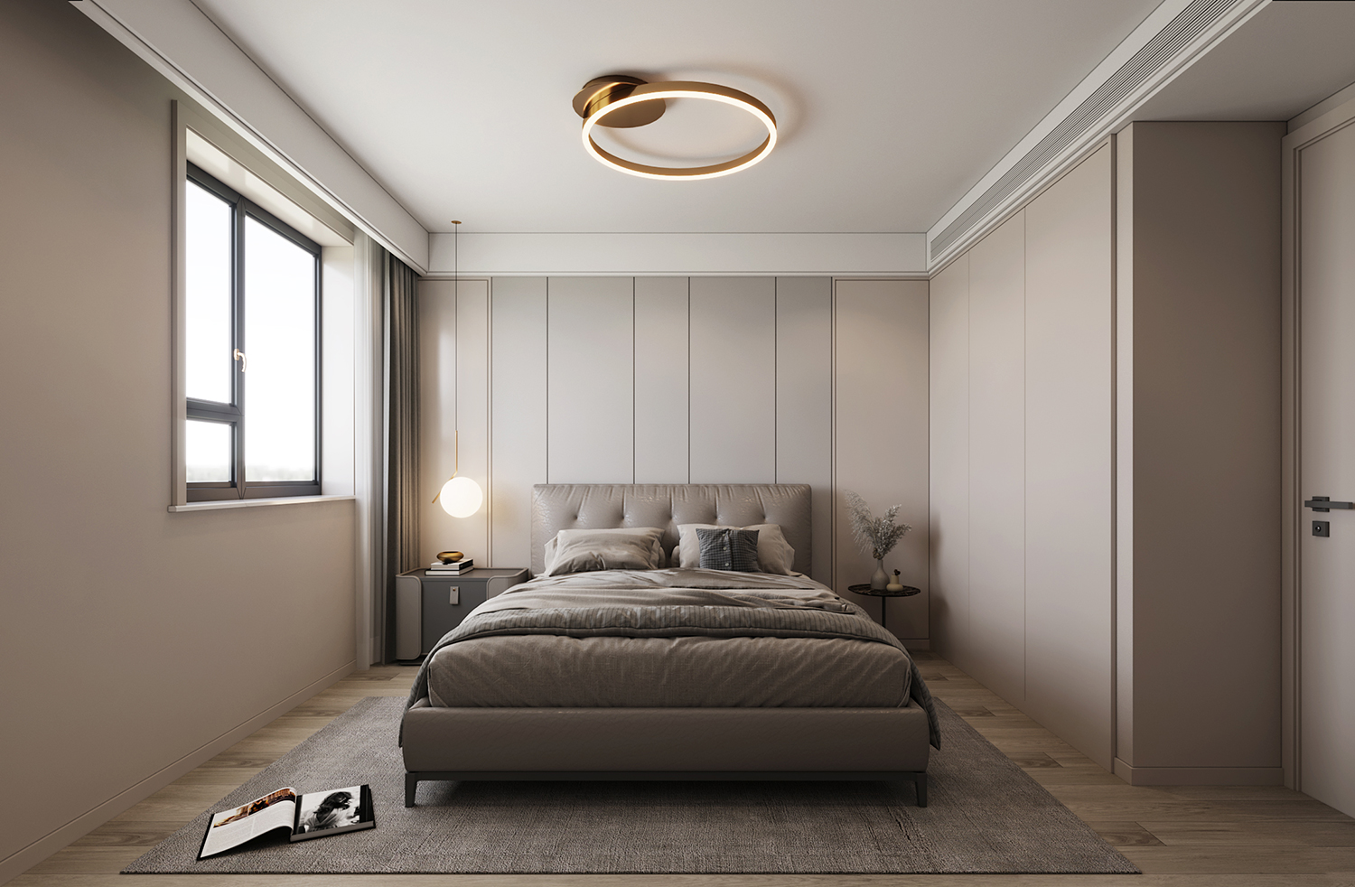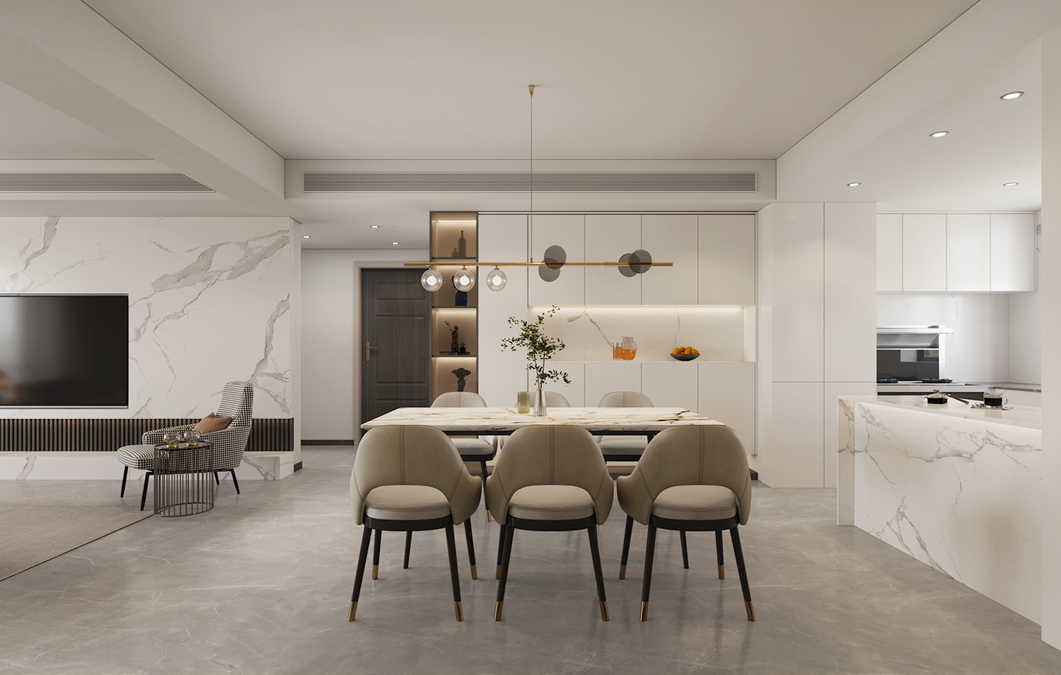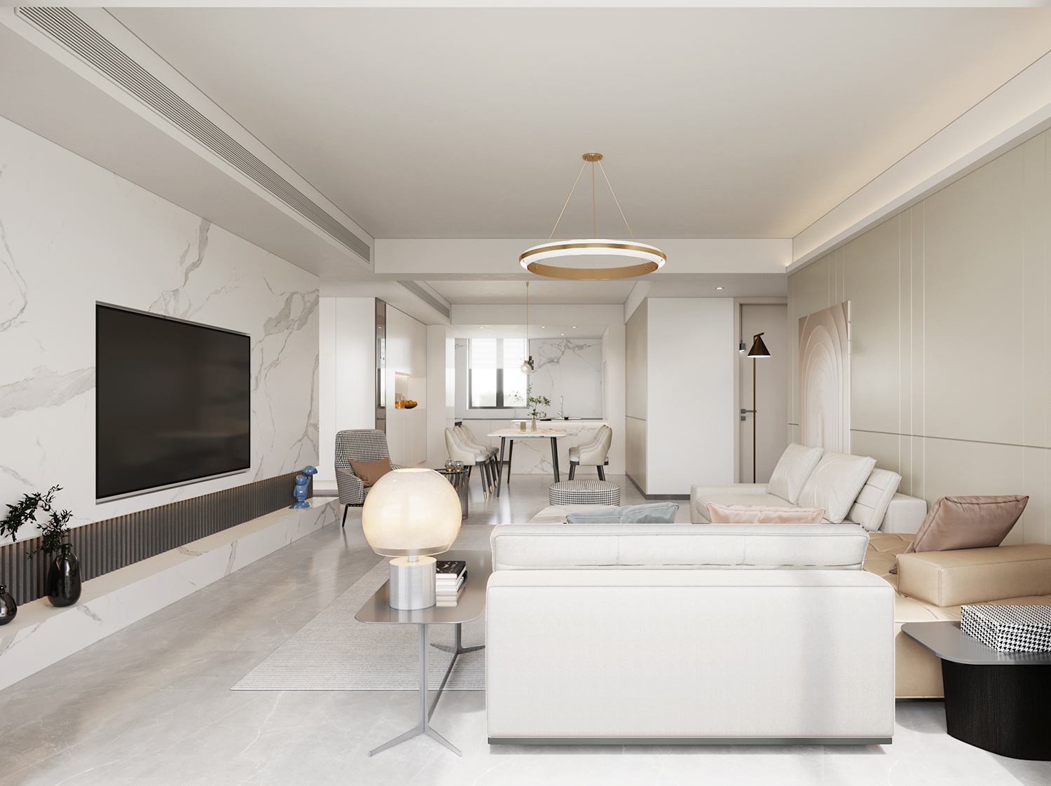 設(shè)計(jì)理念:本案地面采用灰色柔光大板瓷磚鋪貼,讓空間顯得更加純粹且寬敞。超大的開間給予居住者開闊的視覺體驗(yàn),搭配現(xiàn)代主義的家居配飾,整體氛圍簡約而時(shí)尚。