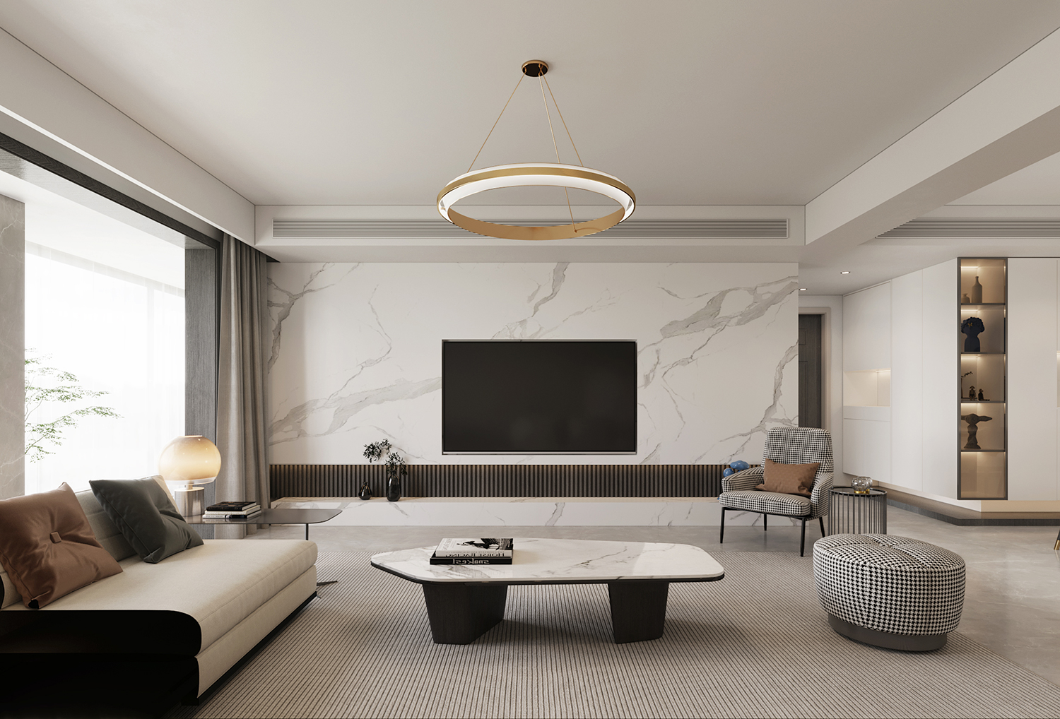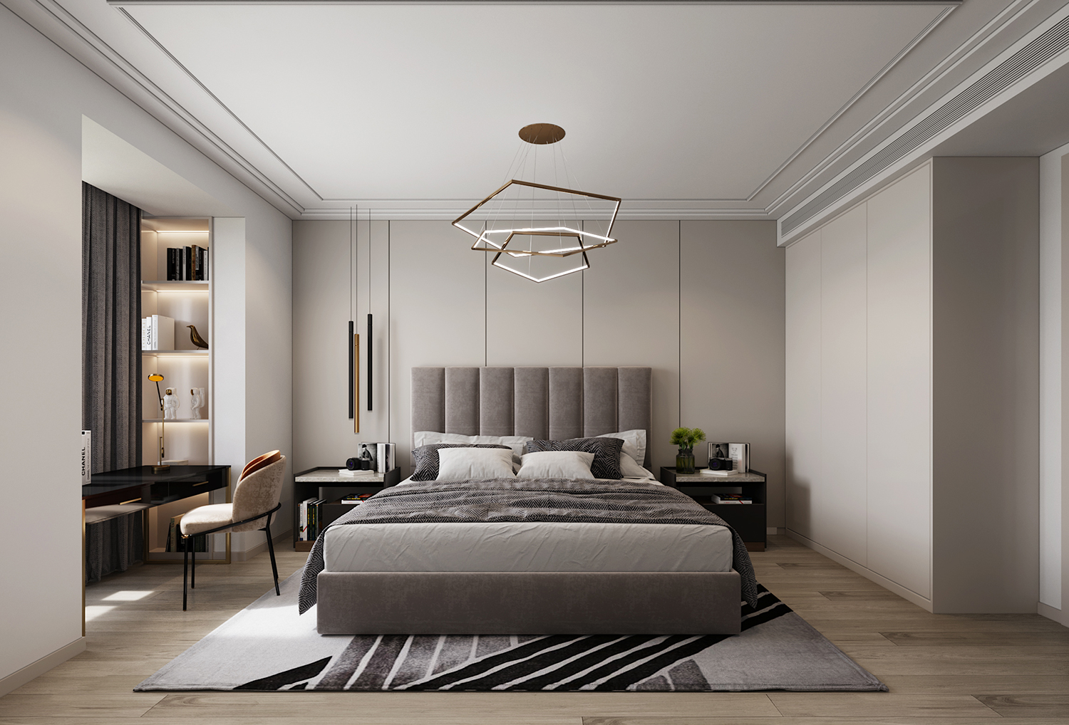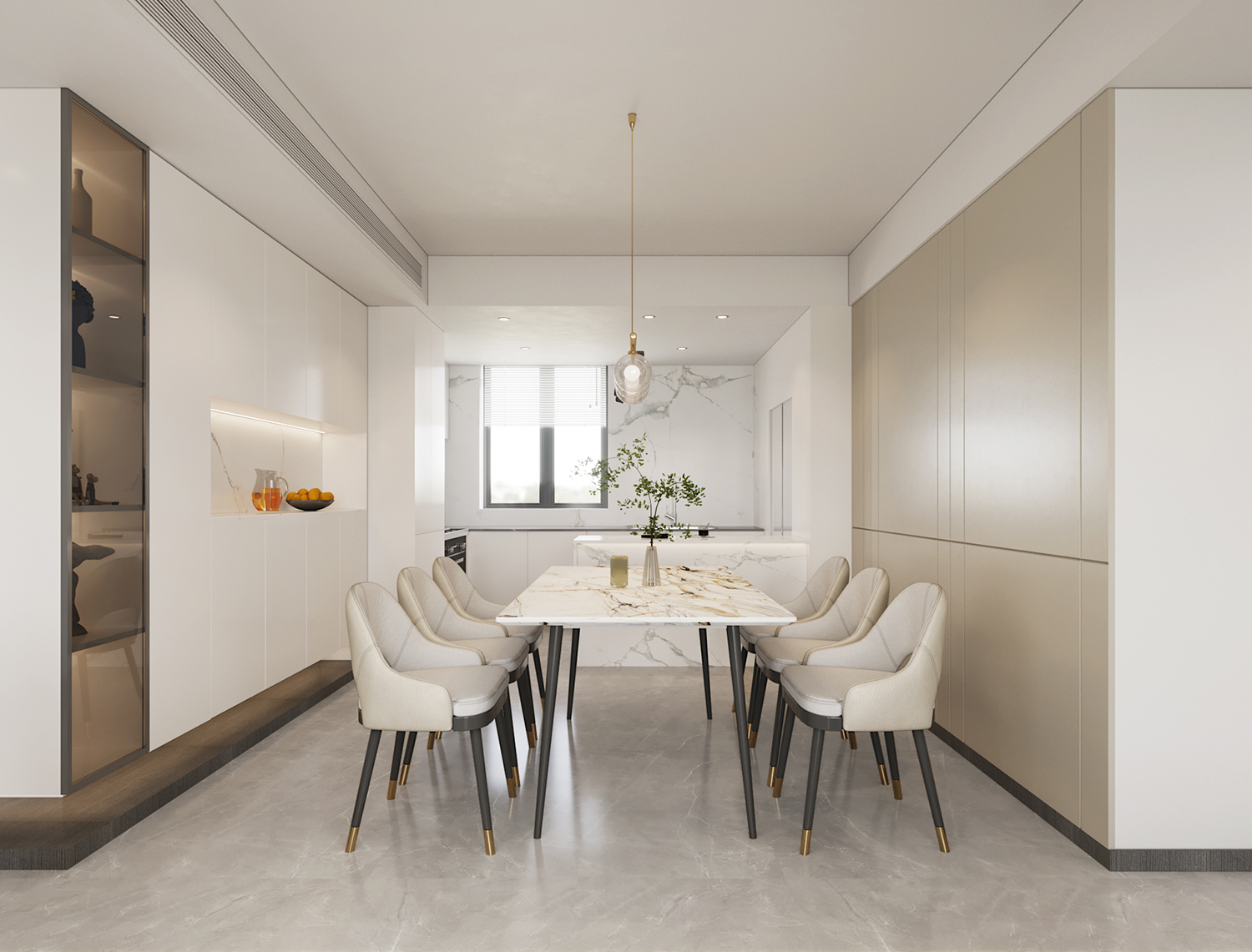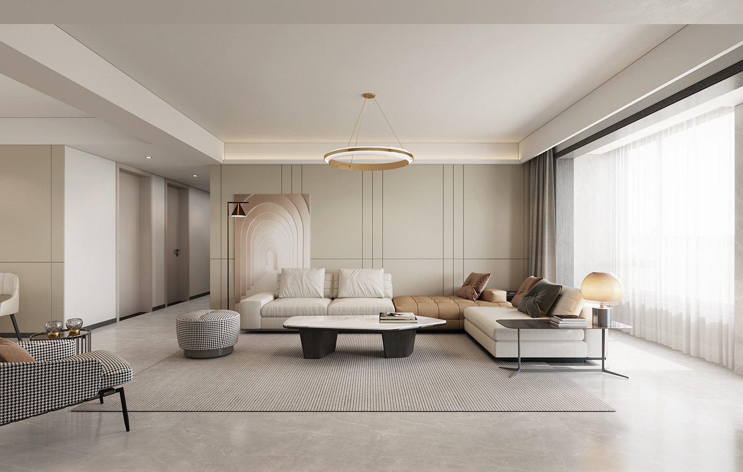 設(shè)計(jì)理念:本案地面采用灰色柔光大板瓷磚鋪貼,讓空間顯得更加純粹且寬敞。超大的開間給予居住者開闊的視覺體驗(yàn),搭配現(xiàn)代主義的家居配飾,整體氛圍簡約而時(shí)尚。