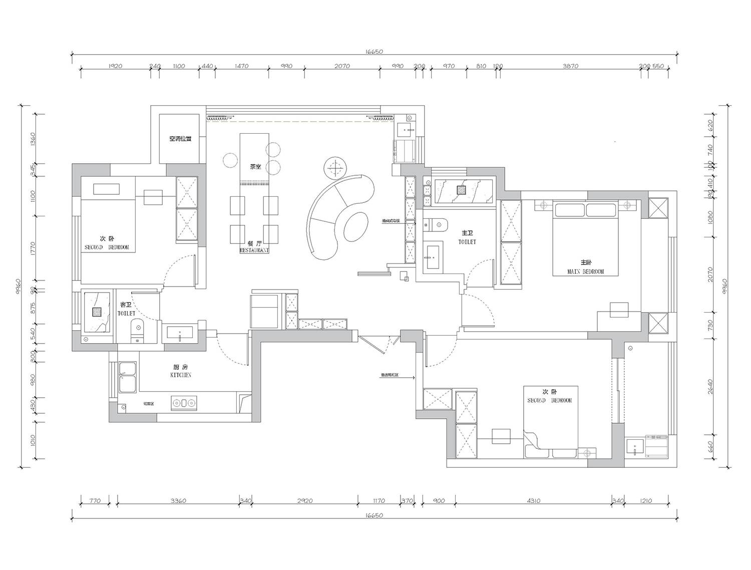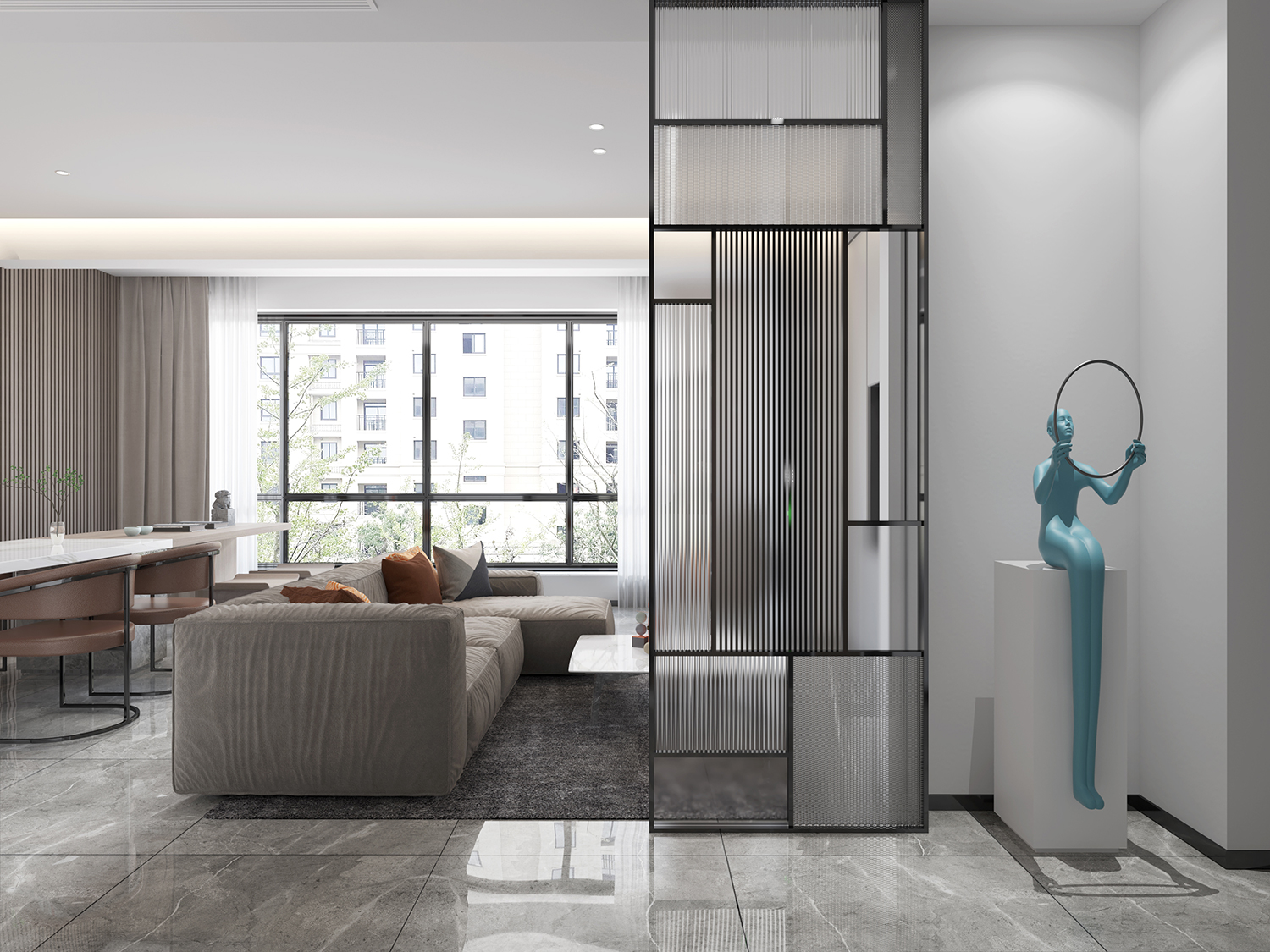 雖然此戶型是客廳朝東的戶型但是采光極好,由于正門口正對窗戶,在裝修風(fēng)水男業(yè)主對這方面比較忌諱。但是又怕這個地方做傳統(tǒng)的玄關(guān)一進門實現(xiàn)有又比較暗。所以采用的是半墻辦玻的的隔斷,放上有個藝術(shù)品使得入門空間的既視感瞬間上來的同是又不會阻擋東向的采光還解決了入戶門正對窗戶的問題。充分的鞋柜空間再加上利用公共空間把冰箱外置更增加了廚房的空間,客餐廳一體的設(shè)計更加增加空間的通透感。加上現(xiàn)代的家具讓整個空間更賤簡介明快。