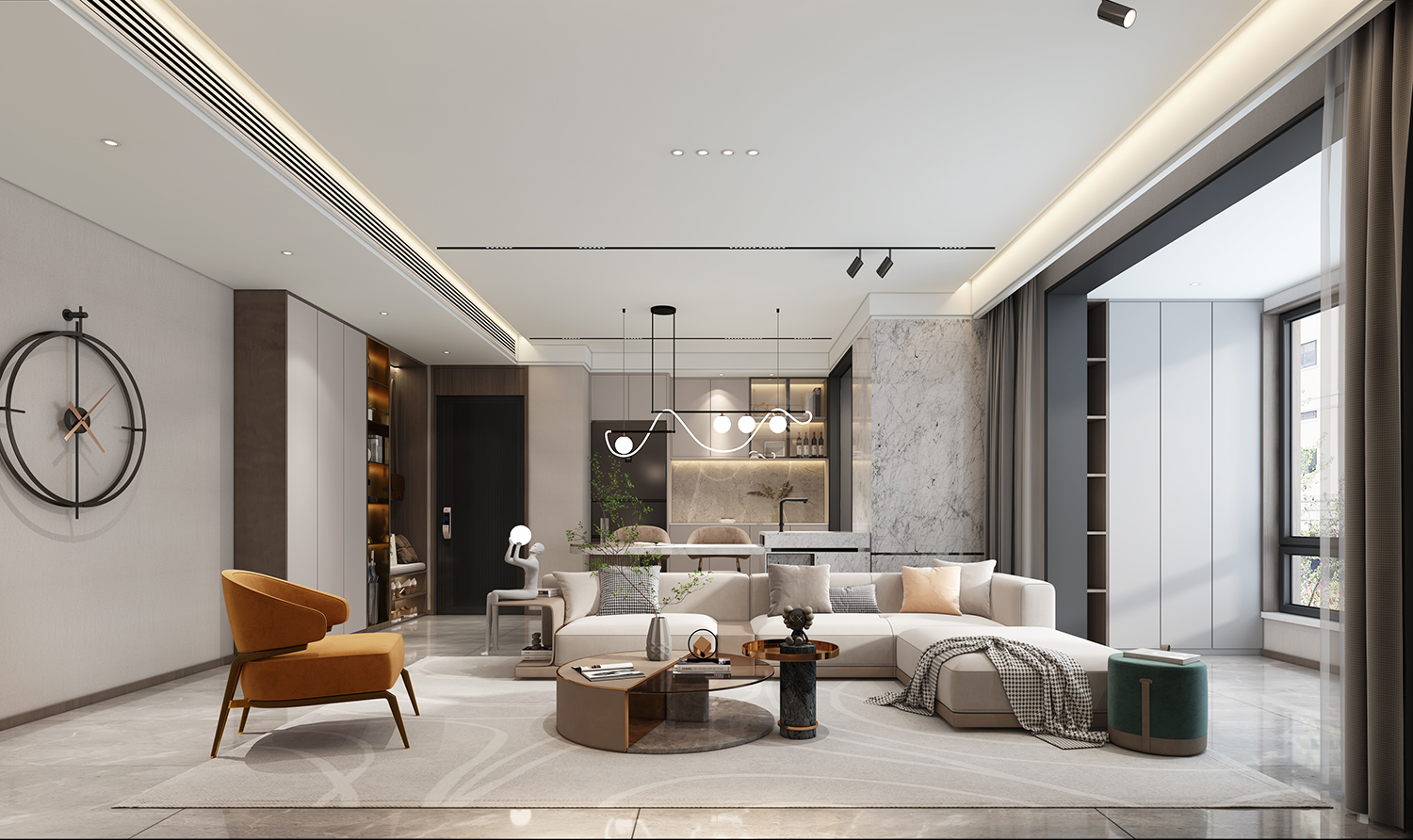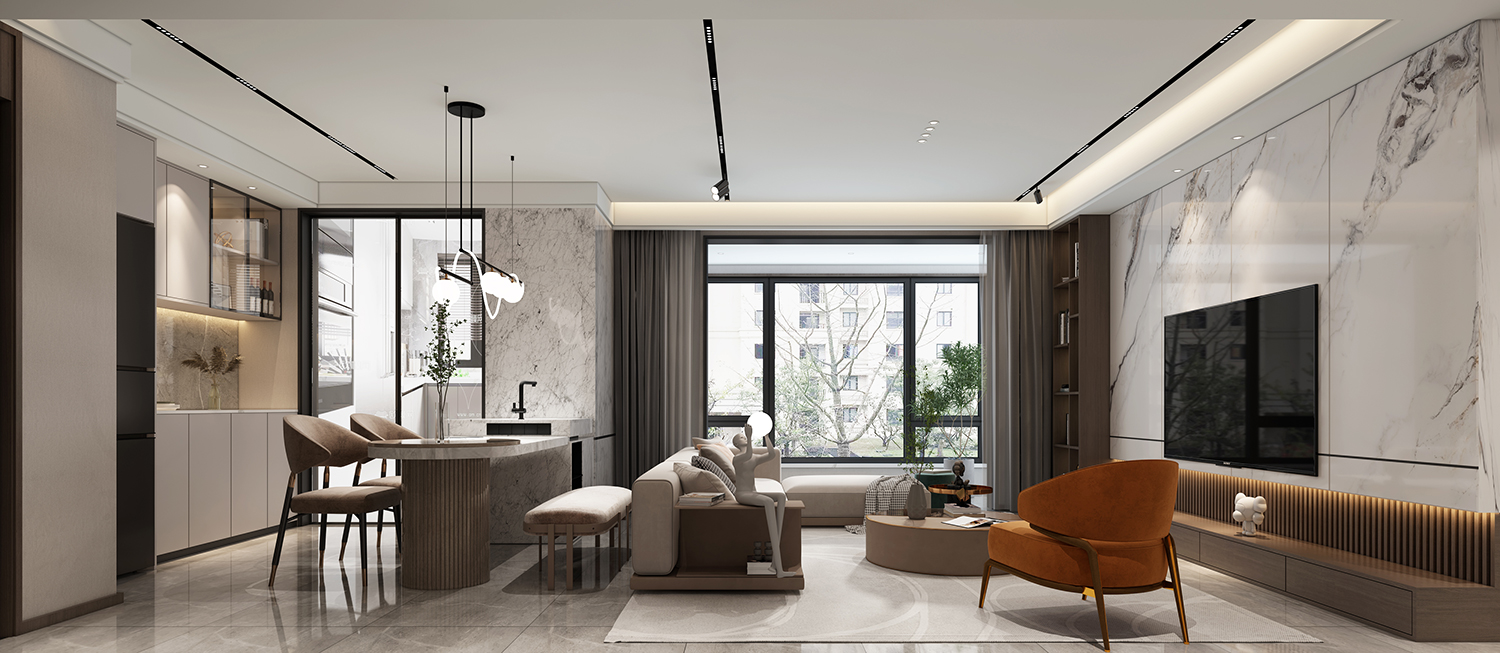 設(shè)計(jì)理念:客廳、餐廳與工作區(qū)融合實(shí)現(xiàn)多場景對話打造生活空間,以連貫的手法和語言造型呈現(xiàn),向內(nèi)外延伸。開放式的格局,讓空間更為寬敞通透,營造舒展的氛圍。
