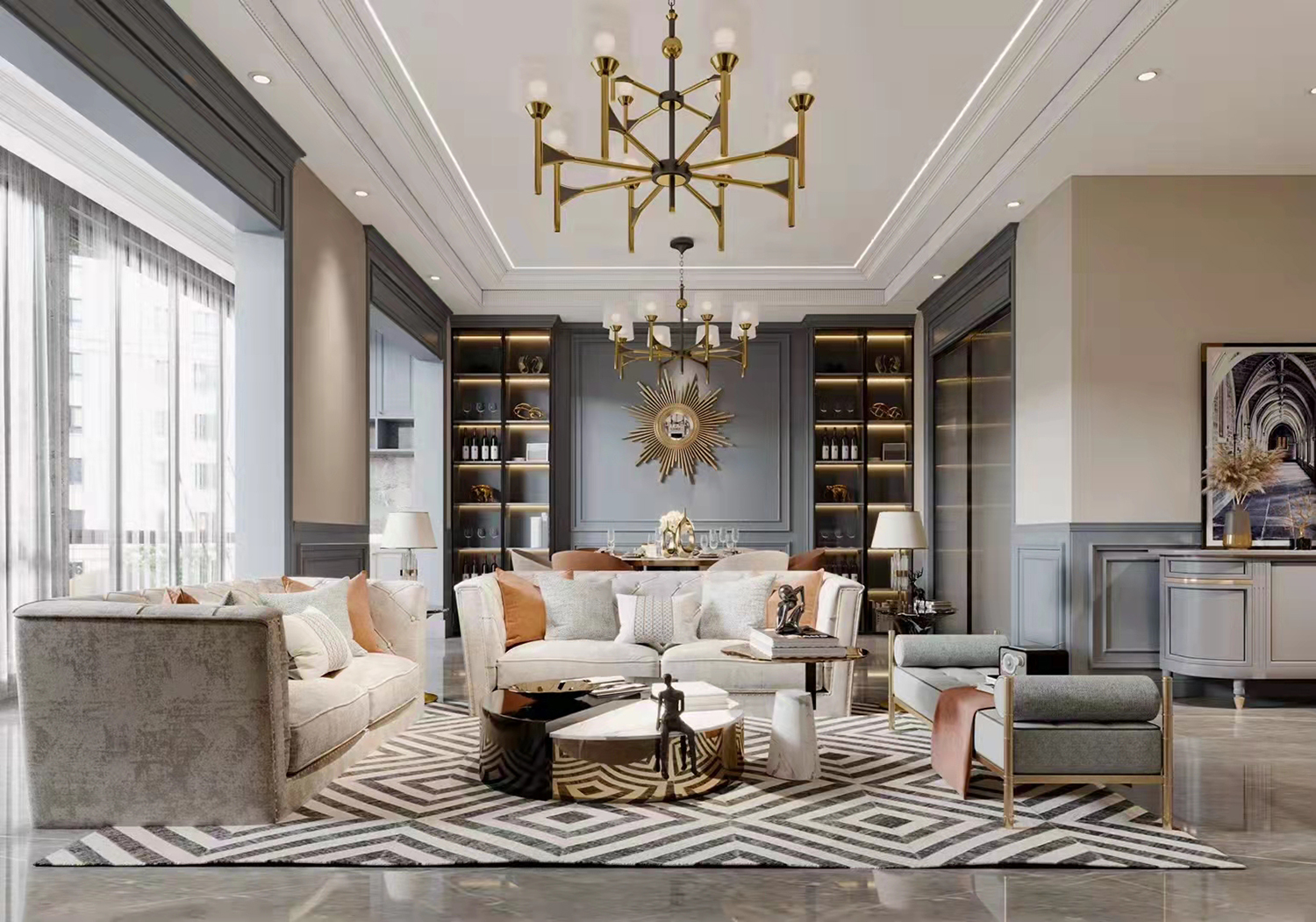 本案特點:色彩搭配是本案中的亮點,各種深淺的藍(lán)、渲染出獨特而濃郁的藝術(shù)氣質(zhì)。線條感家具和造型豐富的燈具,幾筆便勾勒出復(fù)古美式的摩登與簡潔,令空間充滿縱向延伸的遐想。美式的皮質(zhì)沙發(fā),單椅的造型,使藝術(shù)的躍動之美賦于空間之上,圍合式布局的擺放形式使空間看起來更有溫度。