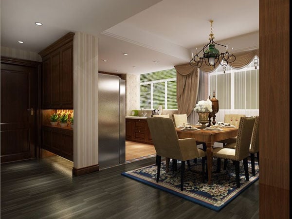 本案特點:這套案例在色彩運用上以深色系為主,成熟穩(wěn)重??蛷d家具都是棕色實木的,質(zhì)樸自然。電視背景條狀壁紙鋪貼,沙發(fā)背景在高檔壁紙上裝飾一副掛畫,很有古典的韻味。