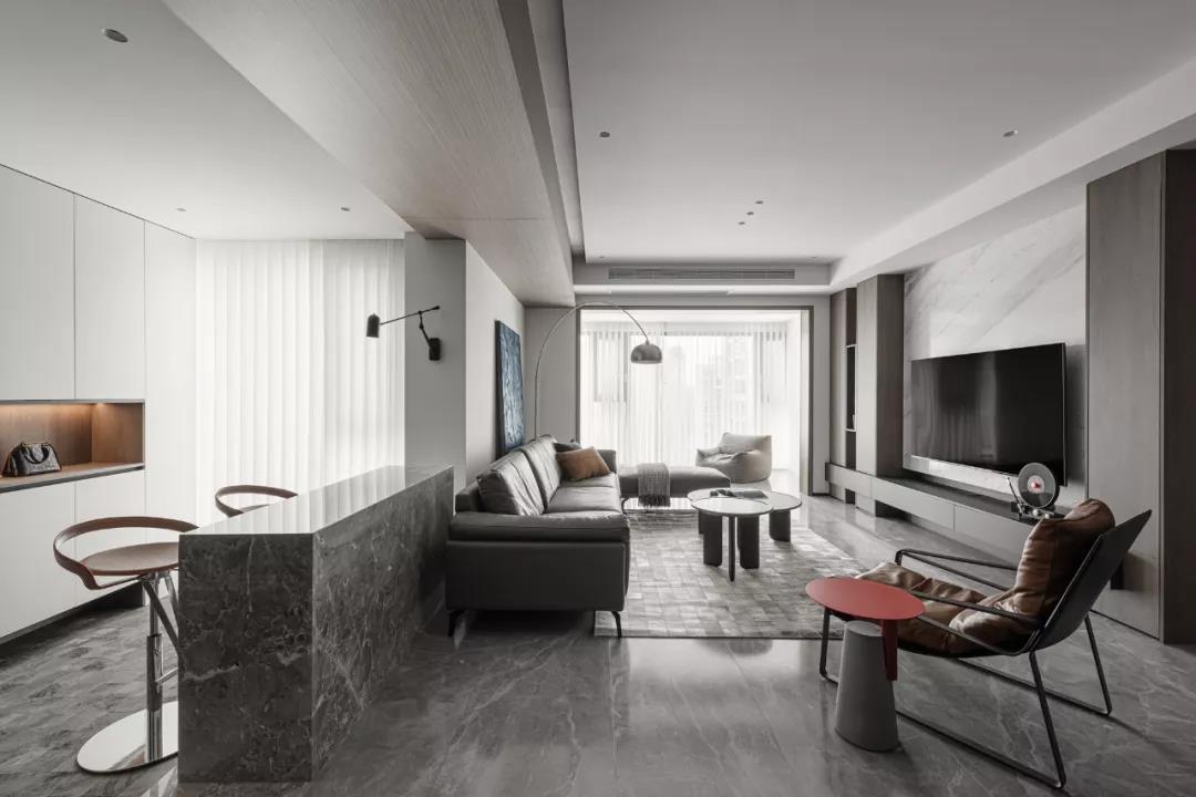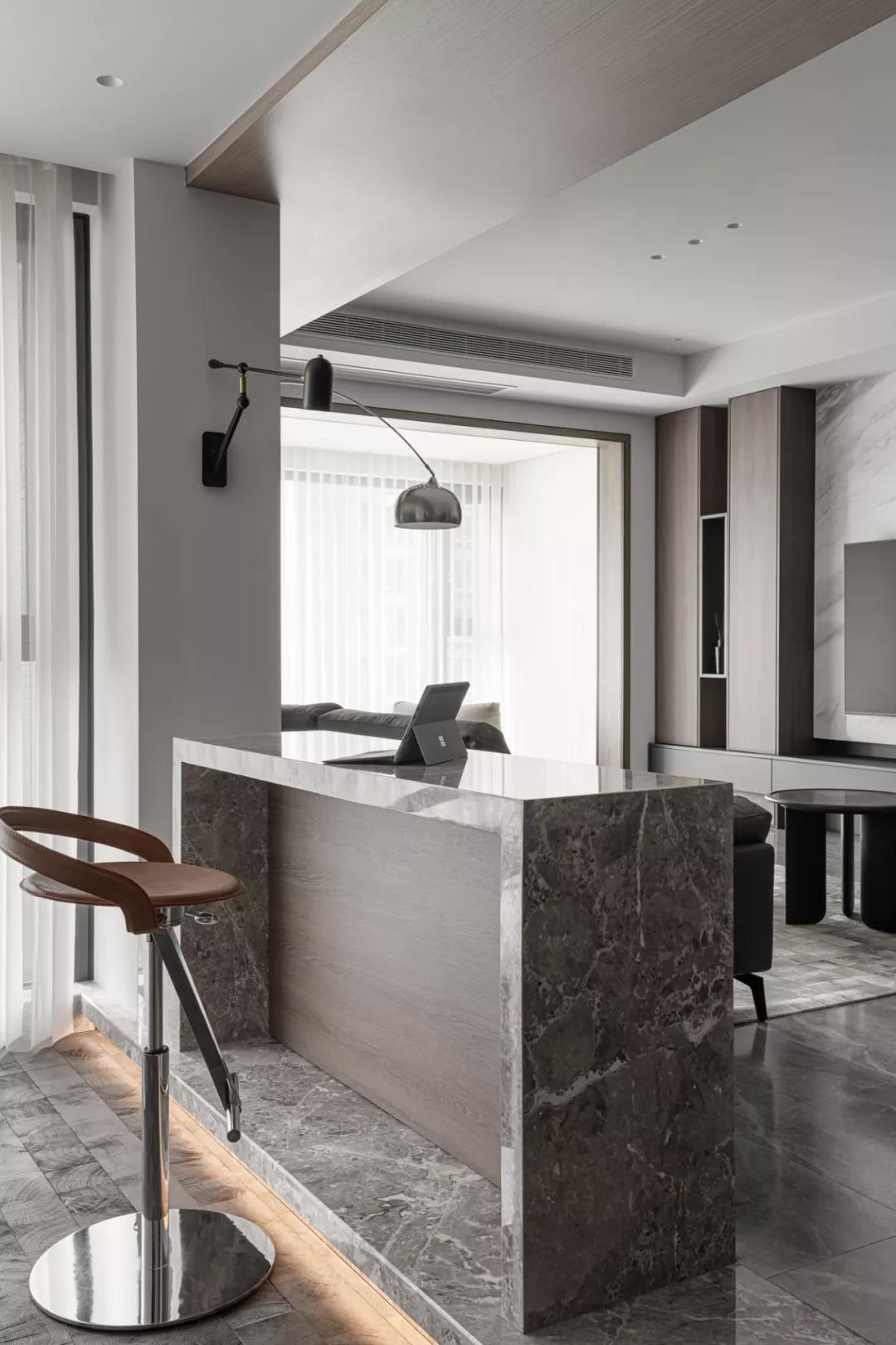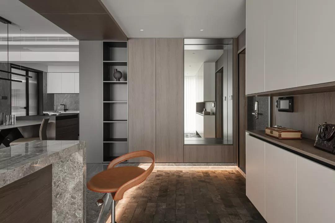 在開(kāi)闊的玄關(guān)處增設(shè)吧臺(tái)作為玄關(guān)與客餐廳之間的阻隔。