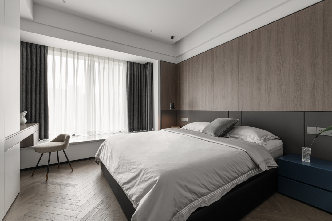 主臥的線(xiàn)條和裝飾極為考究,L型墻板+鯨魚(yú)灰皮質(zhì)硬包,呈現(xiàn)出與居者一致的生活哲學(xué)和審美情緒。
