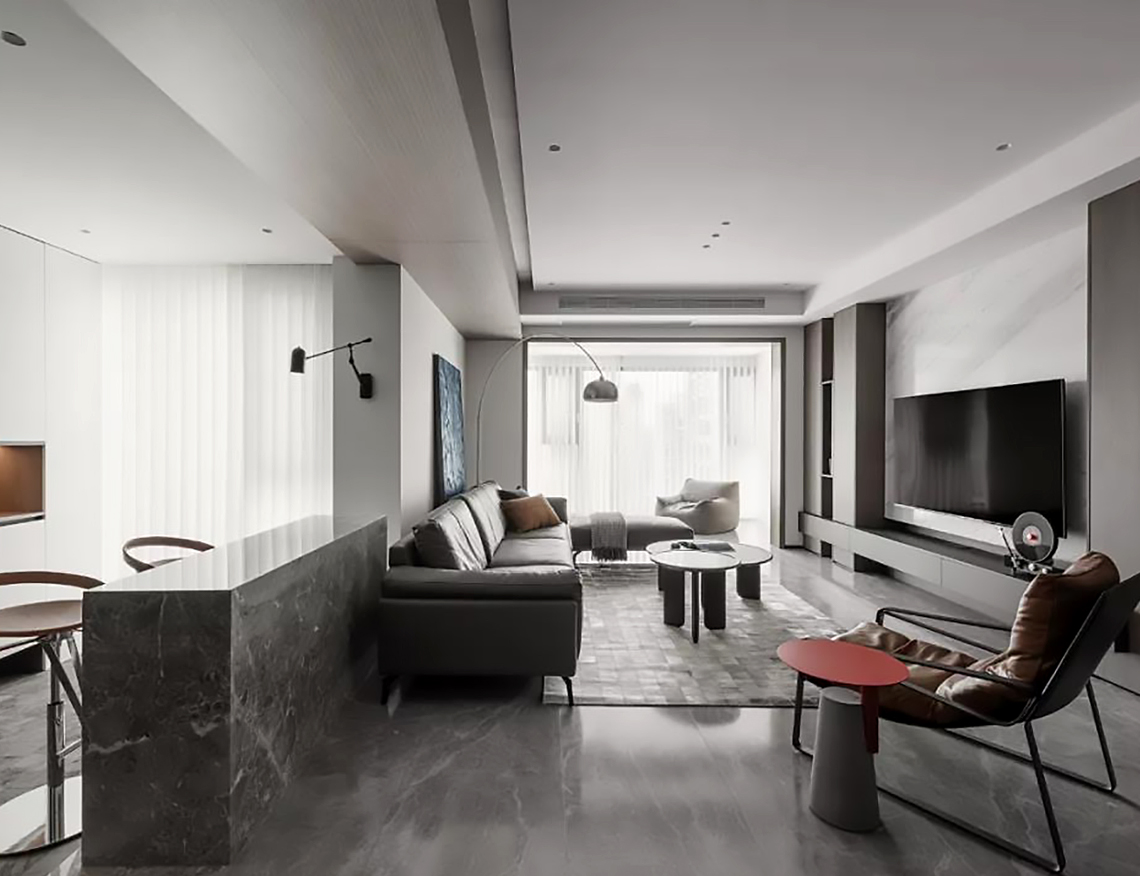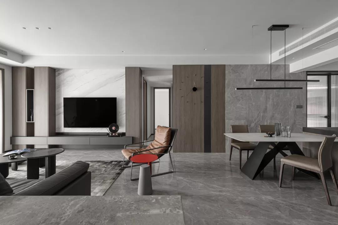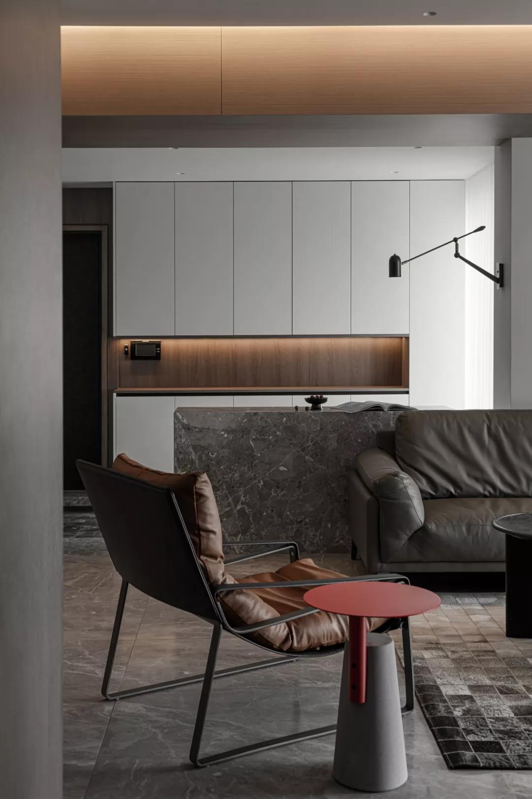 設(shè)計(jì)理念:客餐廳與懸掛位于同一空間,給人通透的視覺(jué)感受,保證空間的整體和諧。大理石紋路和木制結(jié)合,相近的色調(diào)帶來(lái)輕松舒適感。
