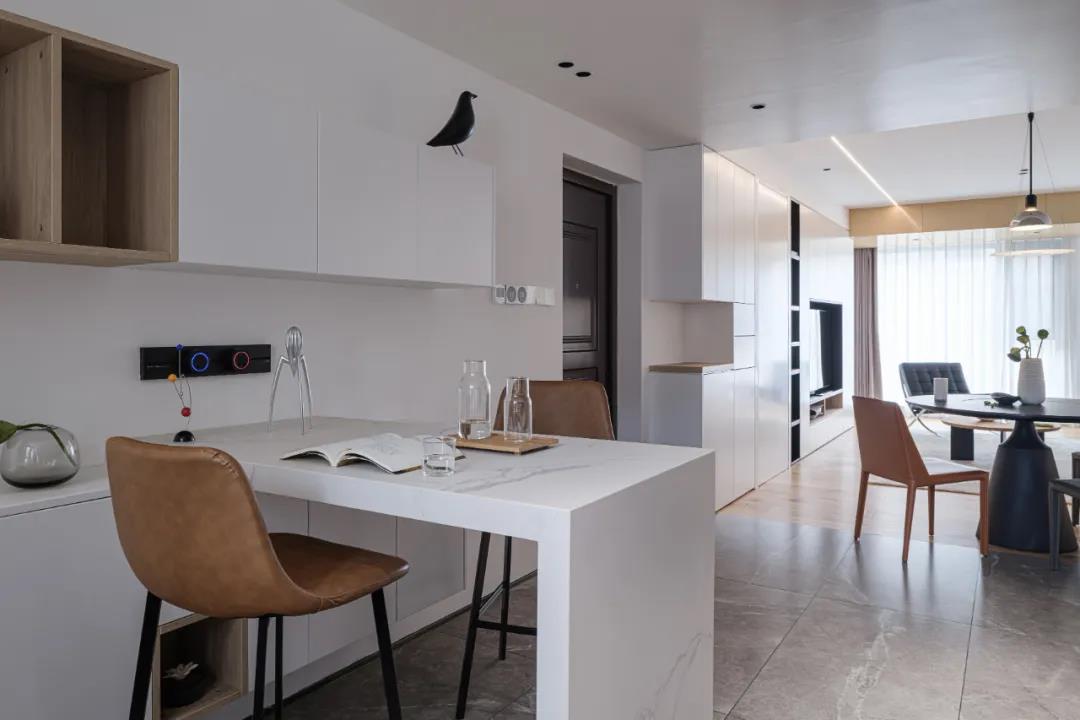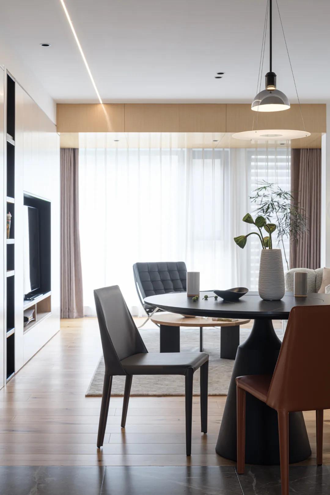 餐桌上方懸掛銀色亞克力材質(zhì)吊燈,用小的軟裝配飾跳脫出硬裝帶來(lái)的嚴(yán)謹(jǐn),將居住者對(duì)于生活記憶的點(diǎn)滴印記,傳遞在這個(gè)空間里。