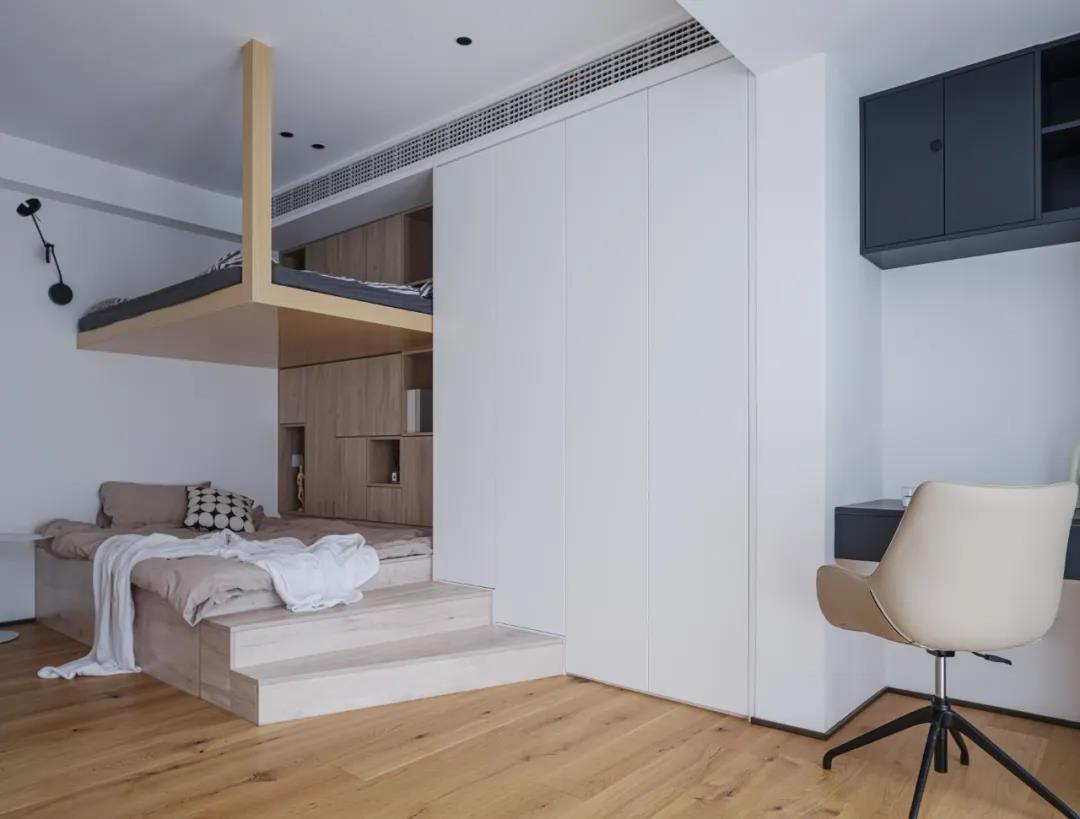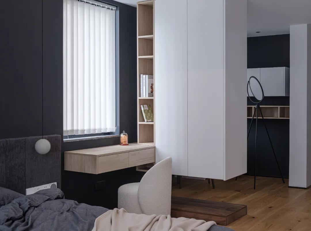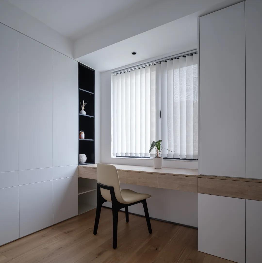 白色點(diǎn)綴原木色帶來(lái)潔凈,到頂?shù)囊鹿衽c開(kāi)放柜為物品提供秩序,窗前的位置做成桌面可以成為辦公的地方。