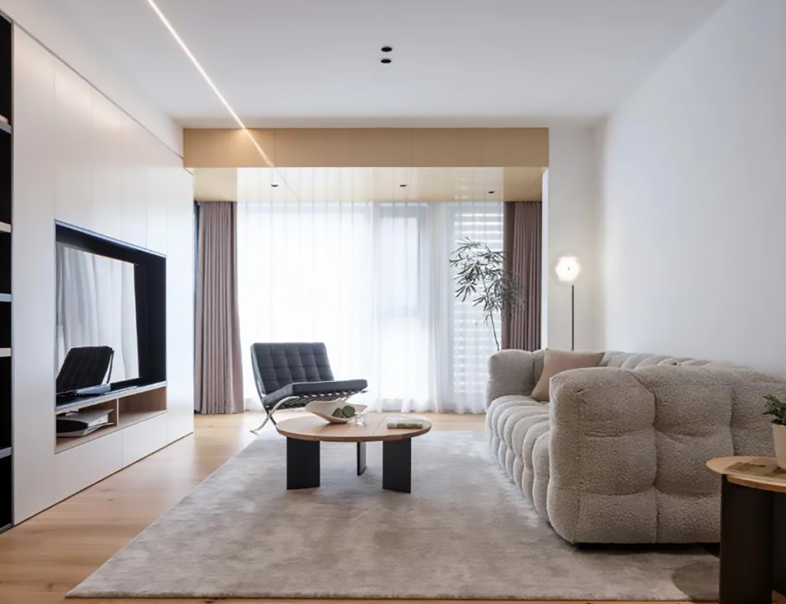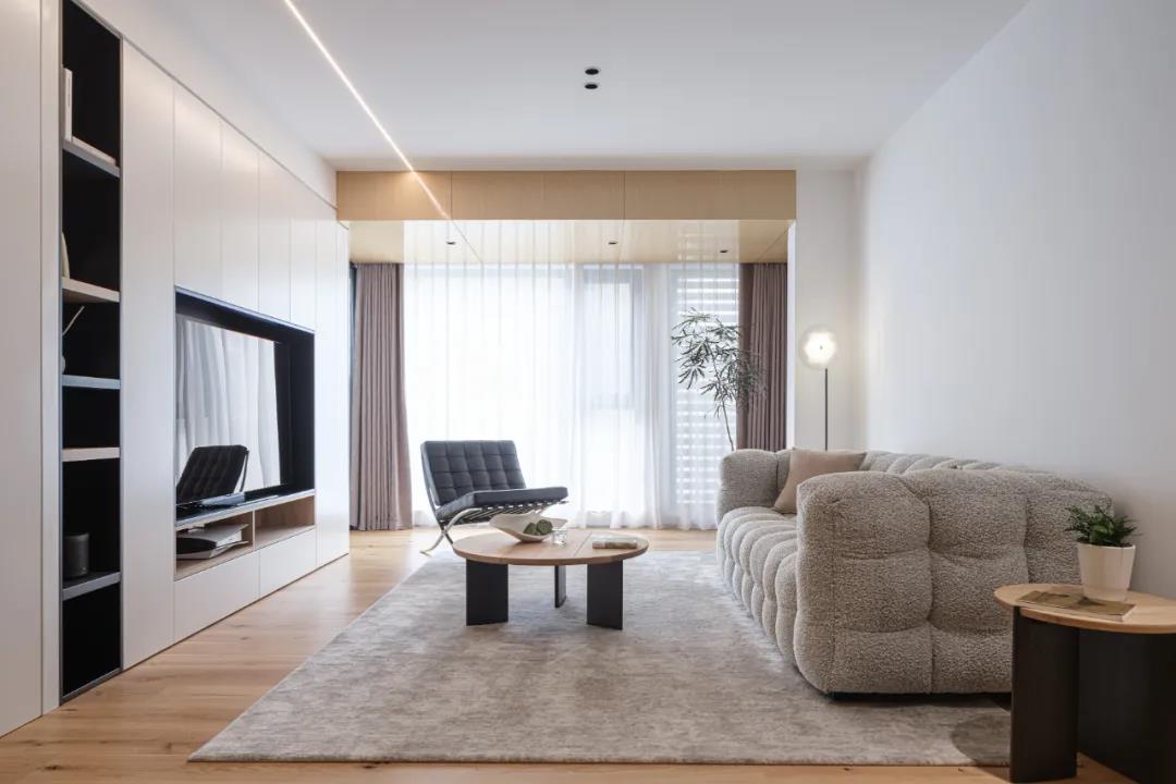 沙發(fā)后的墻面使用低飽和度的乳膠漆保持勻白,和客廳的白色烤漆電視柜形成了空間中雙向并行的流暢,讓整個(gè)空間都沉浸在柔和的氛圍里。