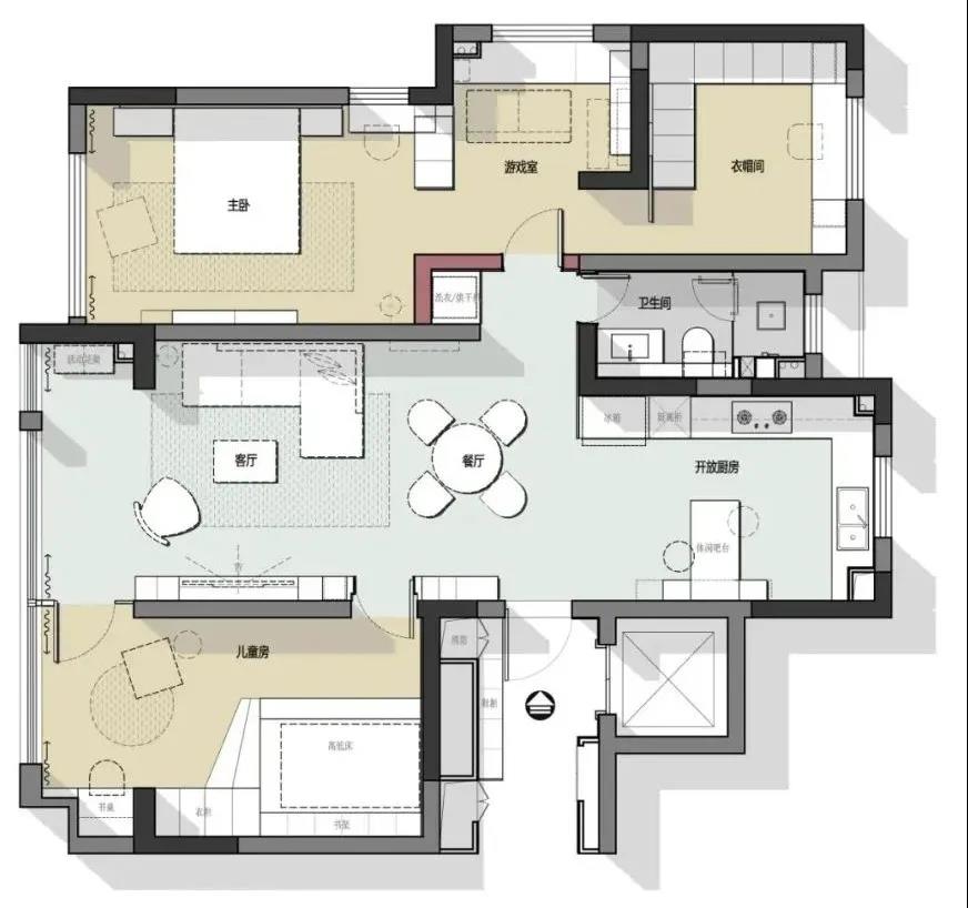 未來(lái)的兒童房,放置了男主人兒時(shí)就喜歡的高低床,等爬梯和圍欄定制好就可以先行投入使用,被納入的陽(yáng)臺(tái)空間靠墻體打造孩子的書(shū)桌。