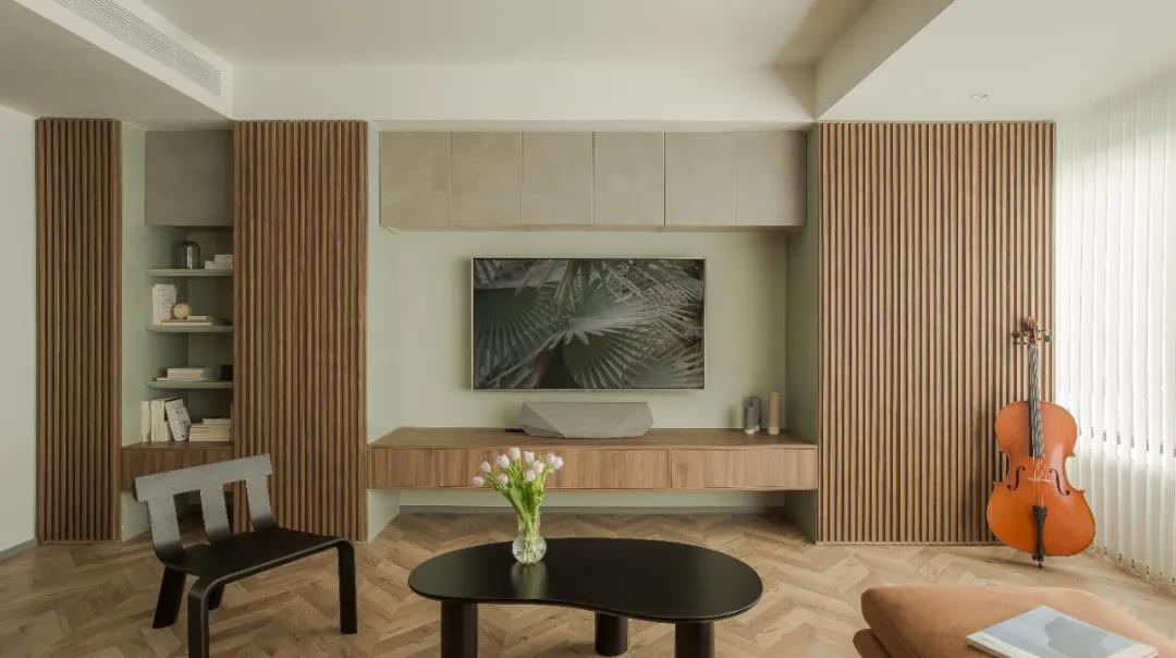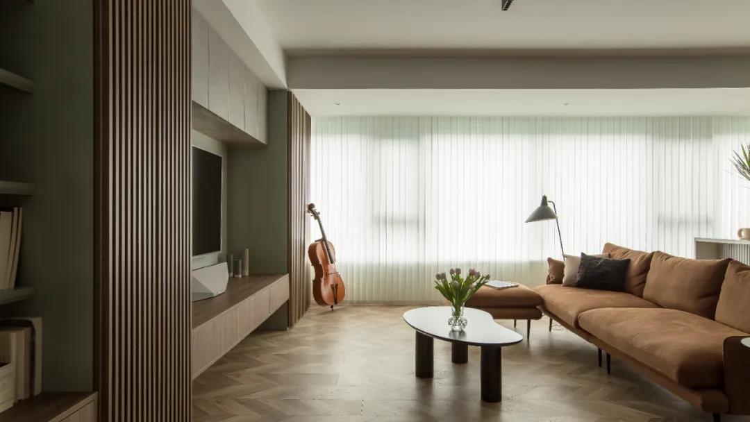 設(shè)計(jì)理念:窗簾選擇了垂直簾,和大面積的木格柵板相映成趣,入室的陽光形成的條紋光影,隨日照方向在室內(nèi)游動(dòng),音樂和陽光同時(shí)在家彌漫。