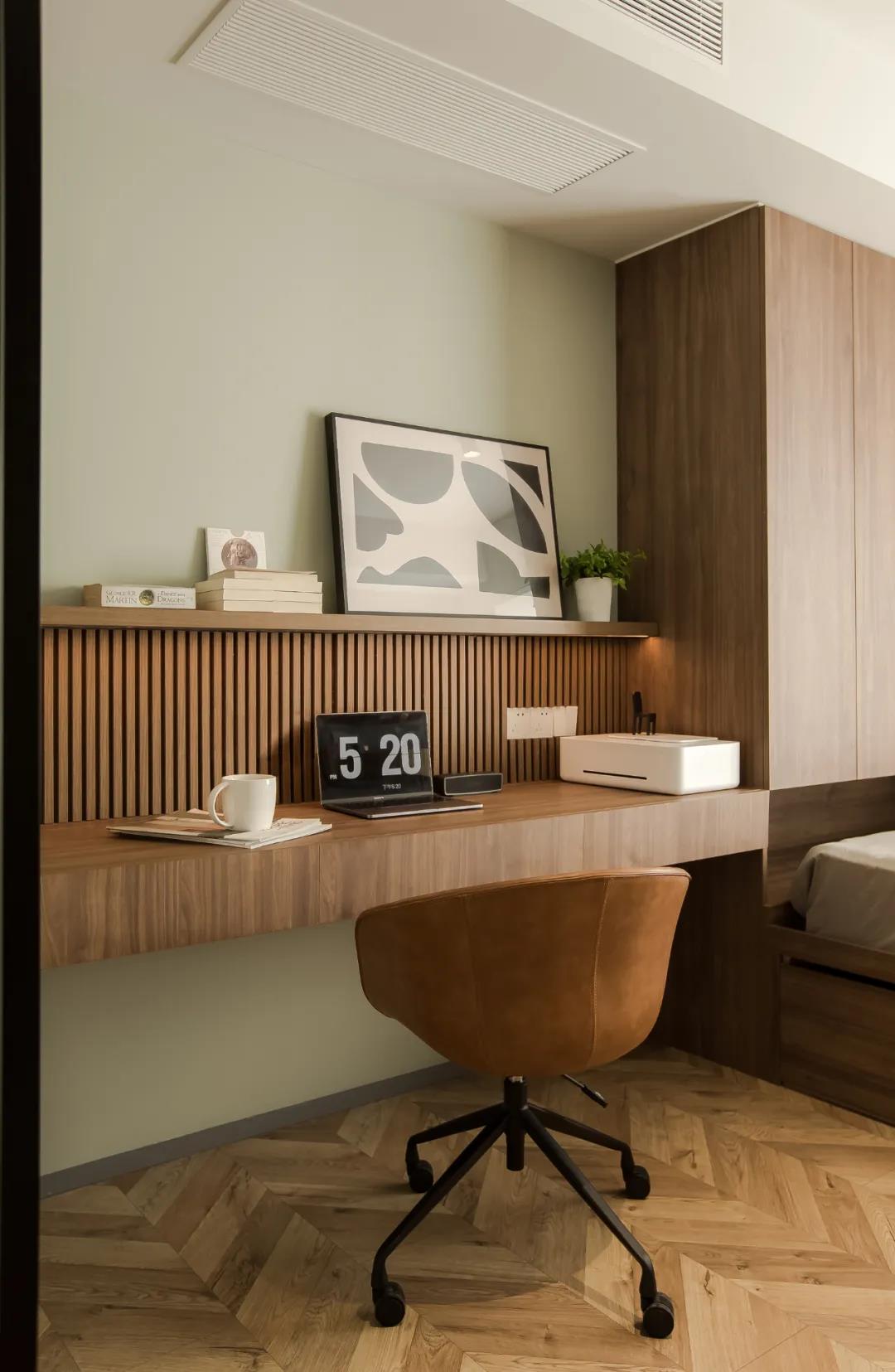 書房設(shè)置了1.6米的榻榻米+衣柜收納,滿足客人到訪臨時(shí)居住的需求,近兩米書桌和書柜組合又很好了滿足屋主平時(shí)在家辦公的要求。
