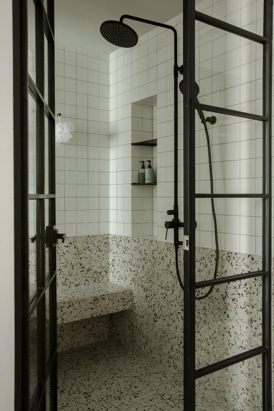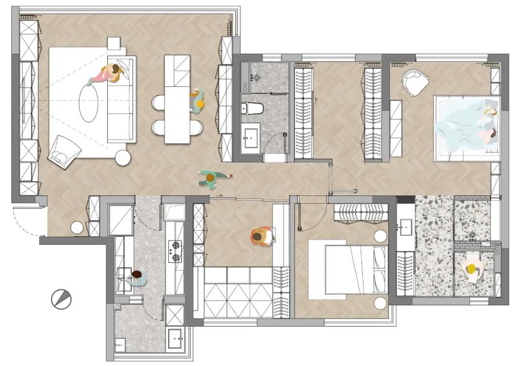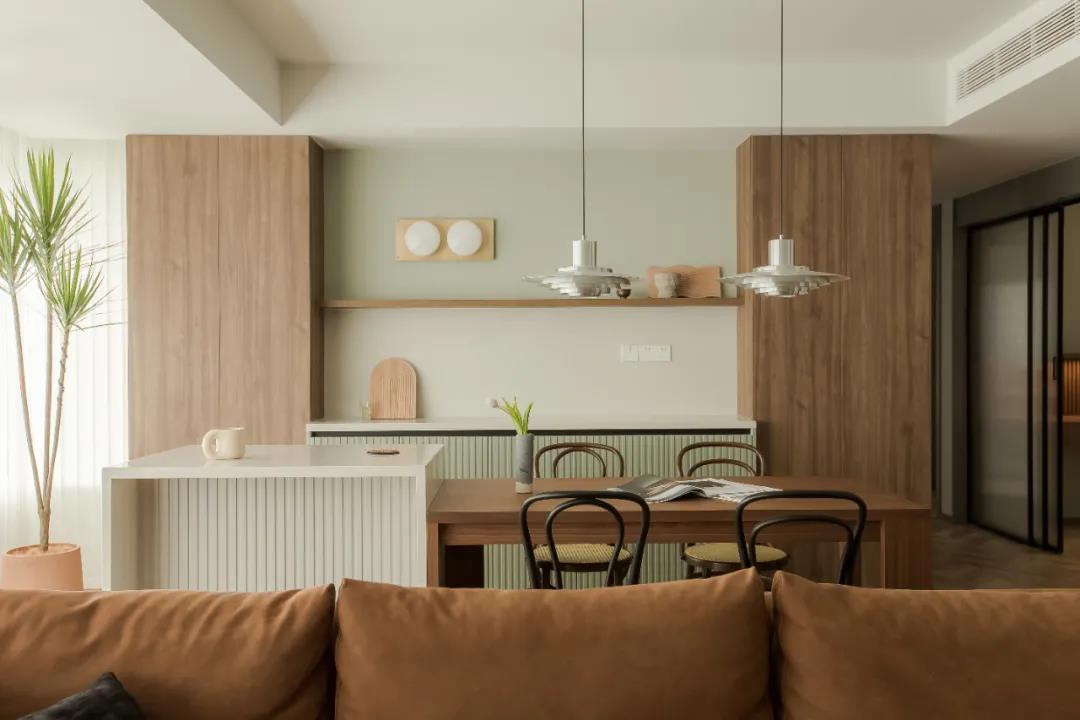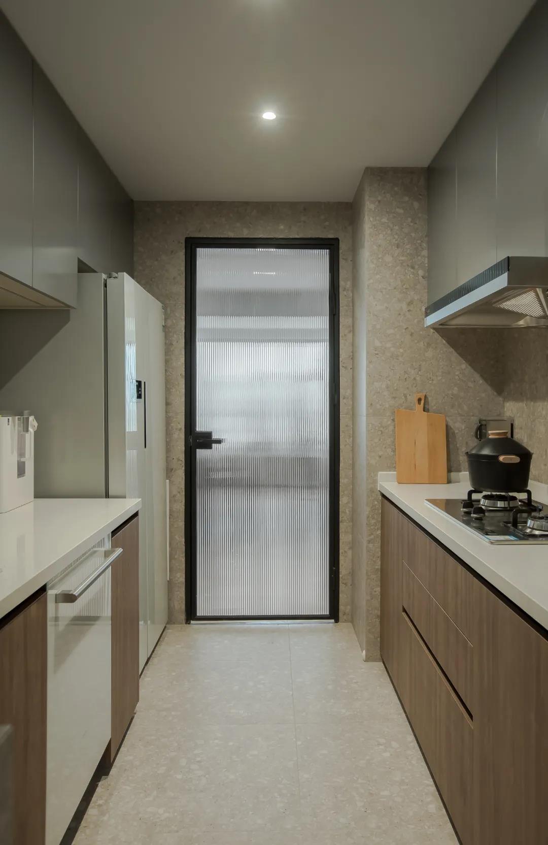 廚房空間的墻地都使用了同款水磨石磚,使空間更加整體簡潔,弱化空間狹長的感受,同時(shí)木色柜體帶出家的溫暖氣息。