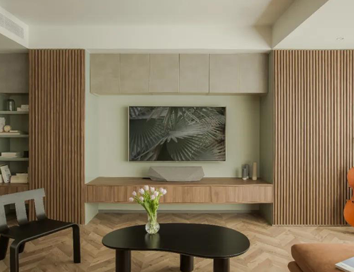 電視墻形成內(nèi)退的結(jié)構(gòu),并利用內(nèi)退空間定制了一整排深度60公分的收納柜,增加空間的可延續(xù)使用性。