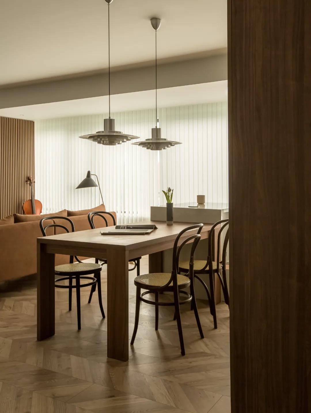 客餐廳串聯(lián),低矮的沙發(fā)靠背造型,在維持空間利落線條的同時(shí),輕巧的拉出場域界限。