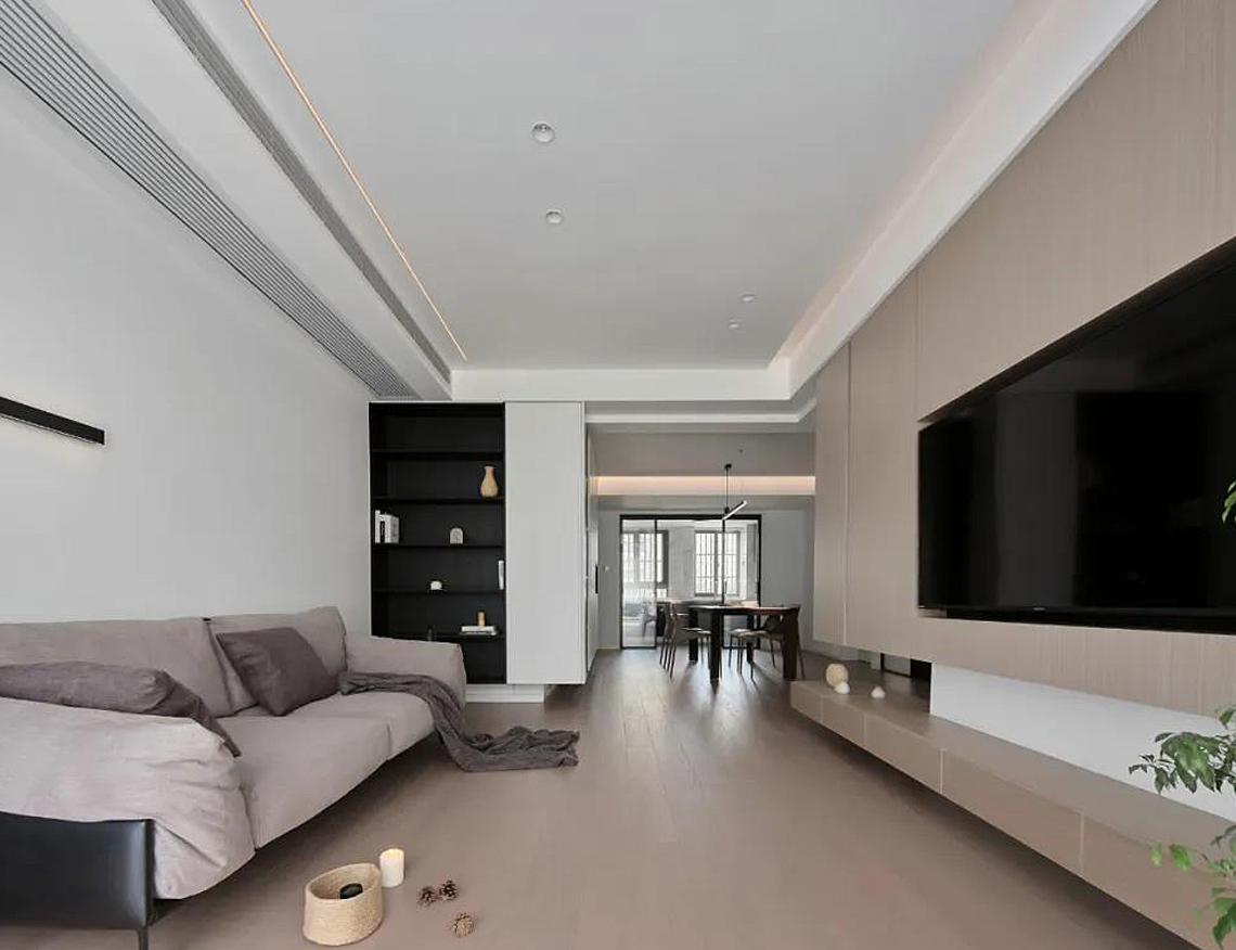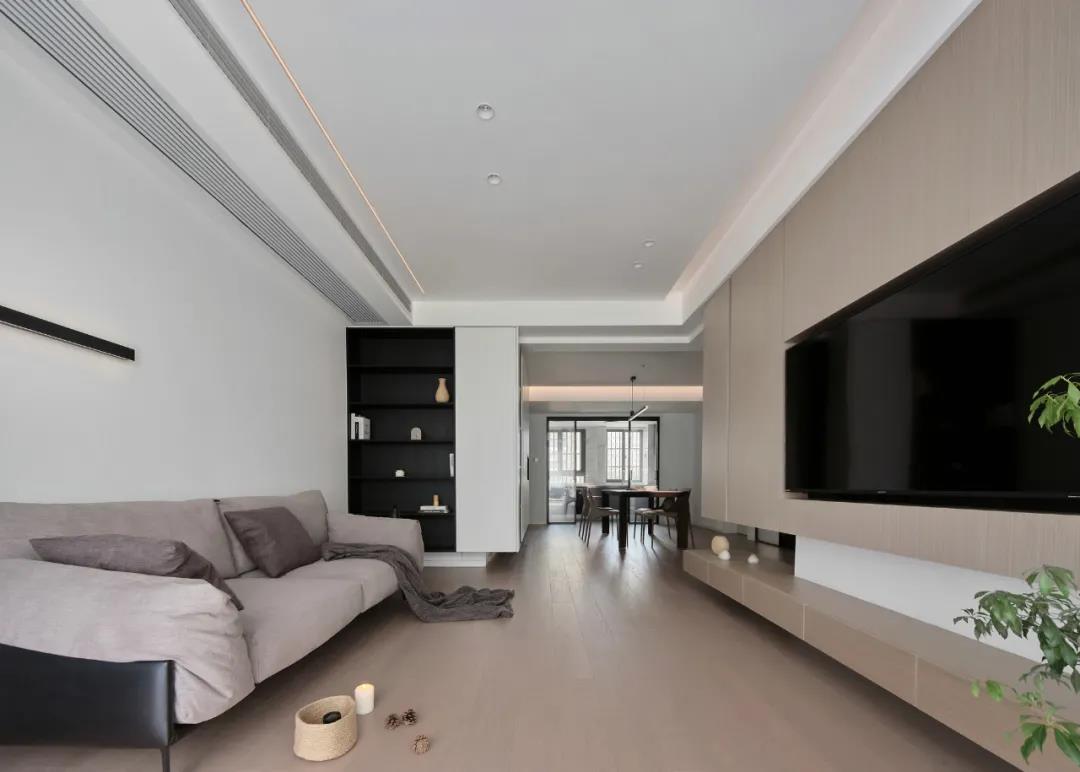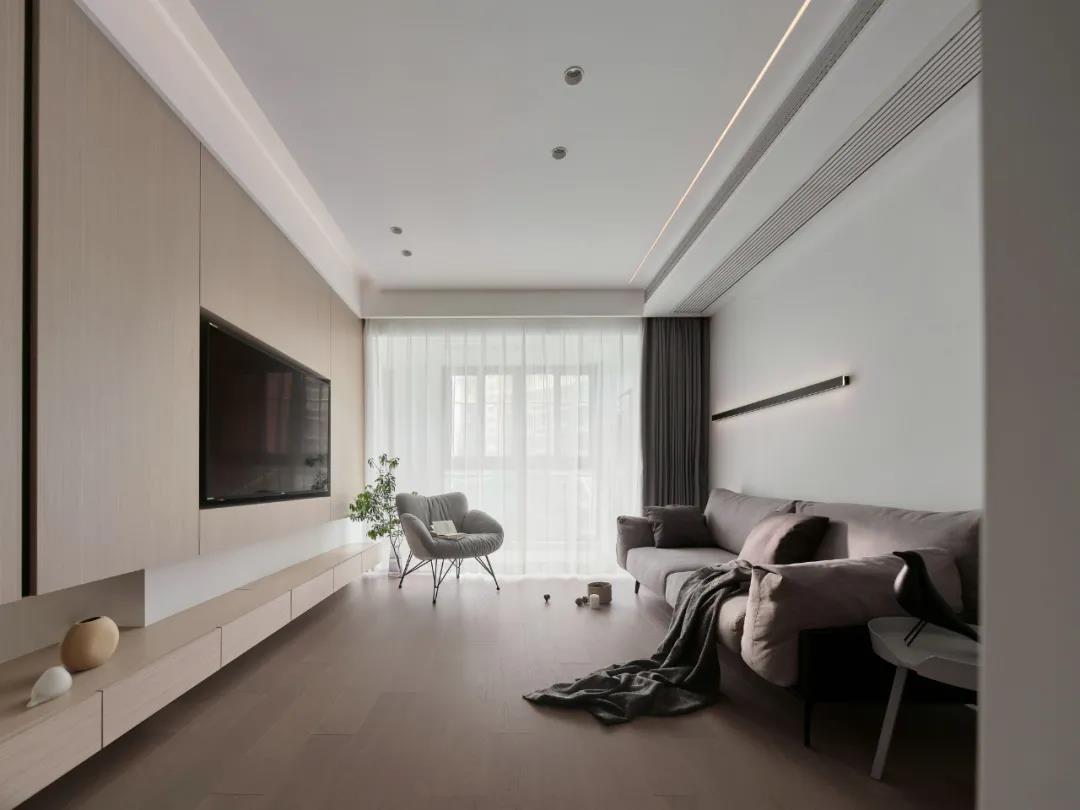 電視背景墻用木飾面裝飾造型,電視內嵌,空間看起來更簡潔清爽,滿足屋主對純凈空間的向往。