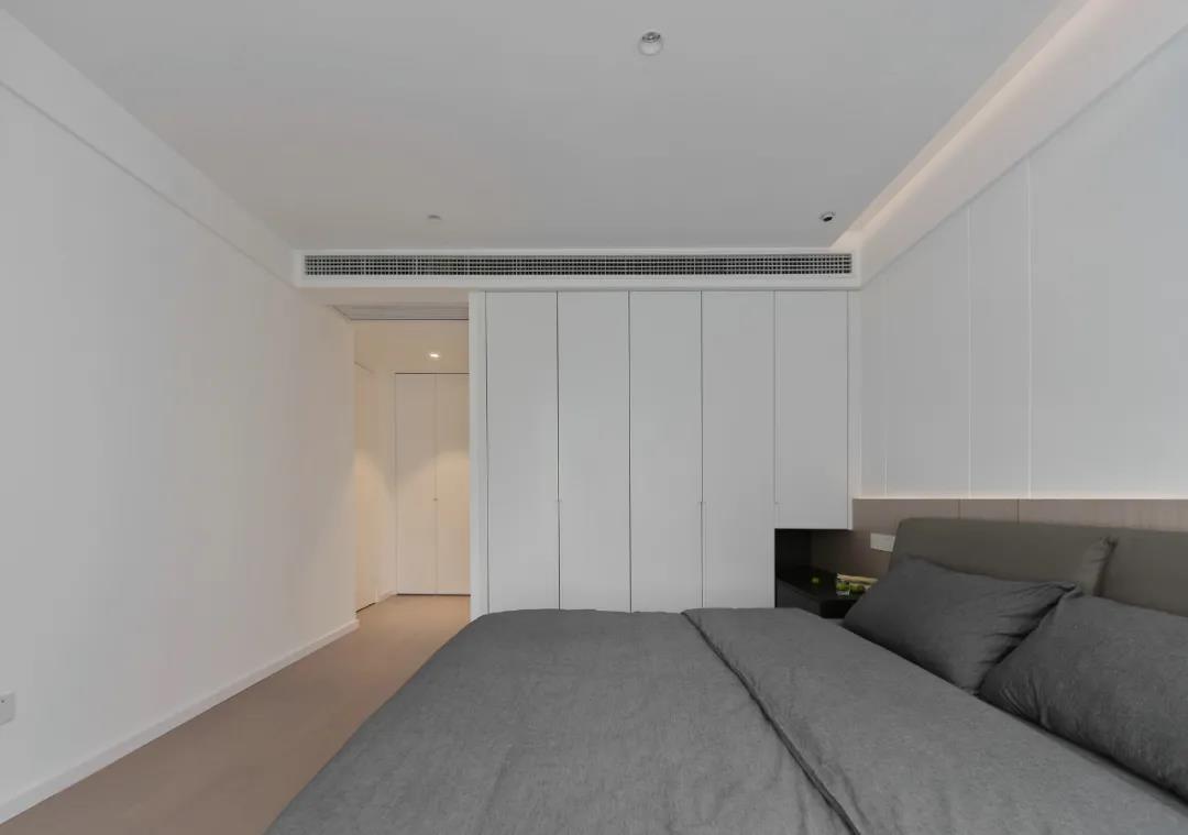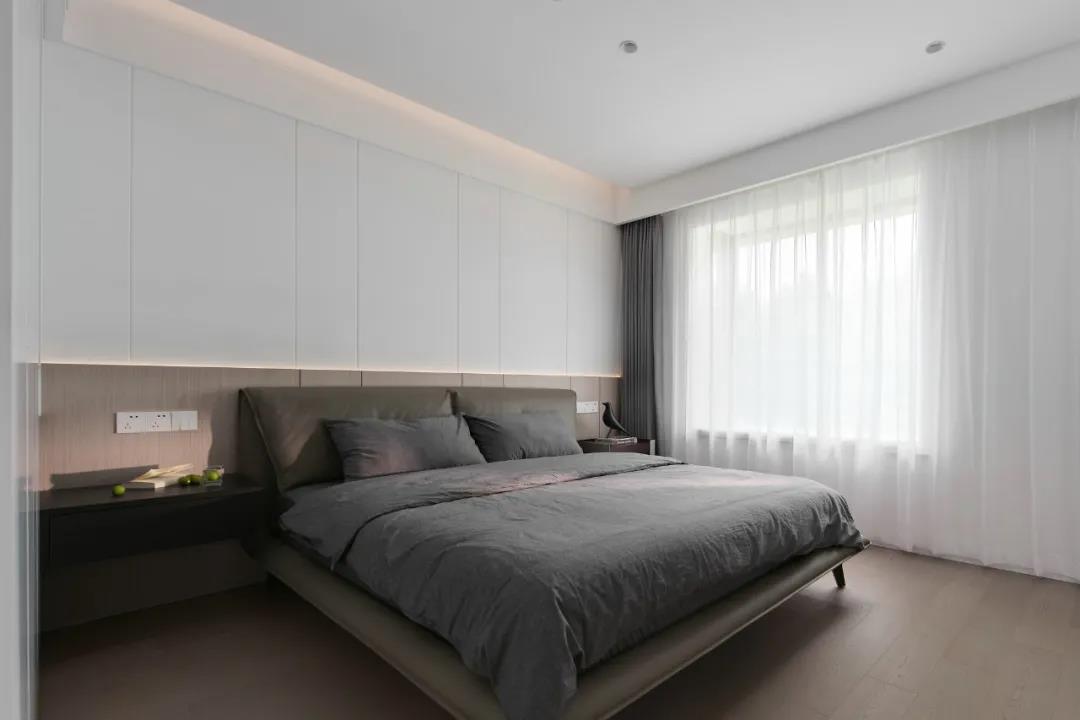 主臥延續(xù)客廳的無主燈設計,簡約的吊頂和床頭背景墻都暗藏燈帶,讓空間更有層次。