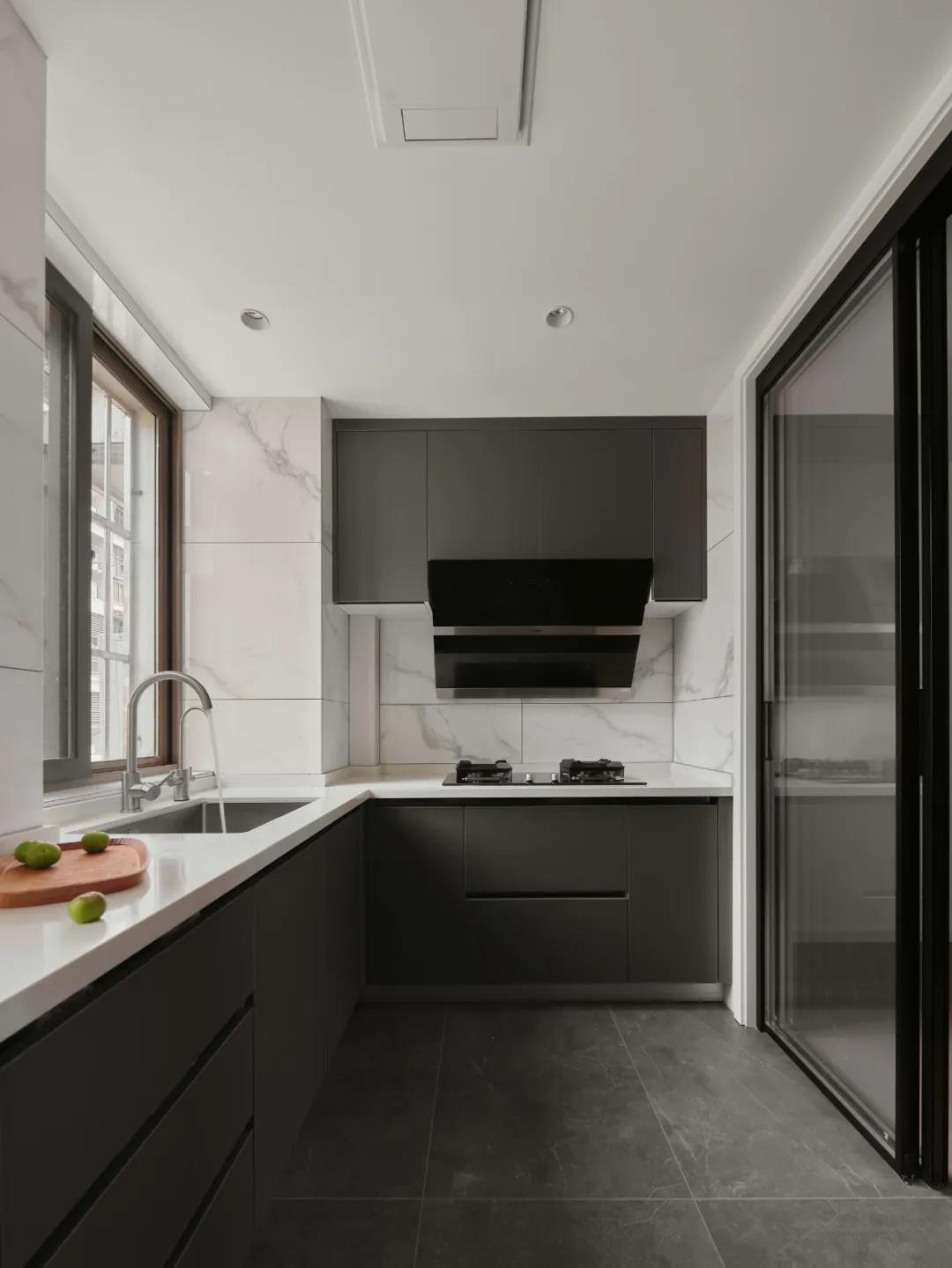 高級灰櫥柜,簡約大氣,大水槽洗鍋刷碗,都很方便,吊柜補充廚房的物品收納。黑色邊框的玻璃移門,讓光線通透,還能隔離油煙。?