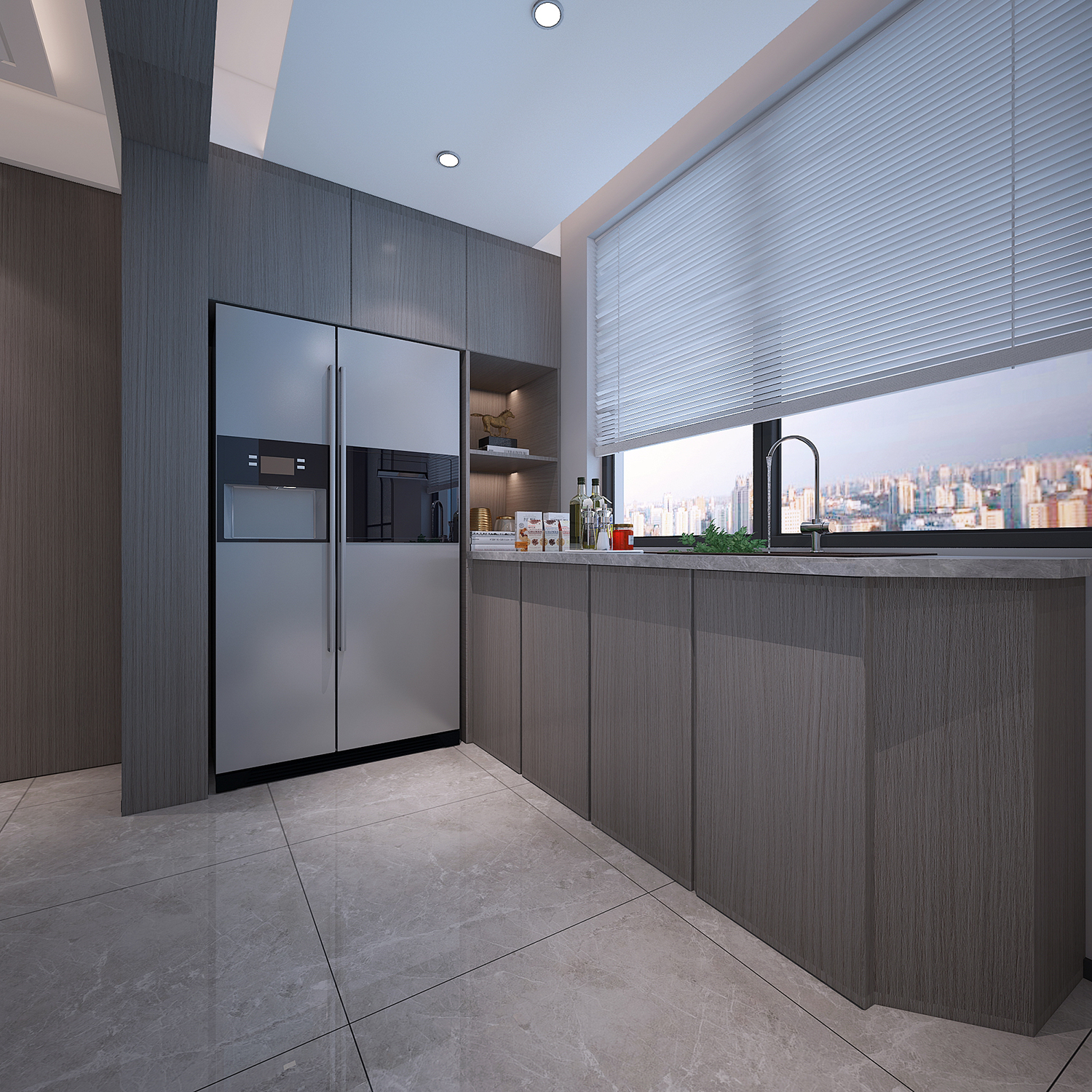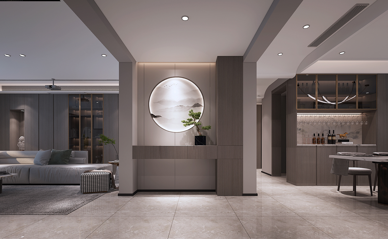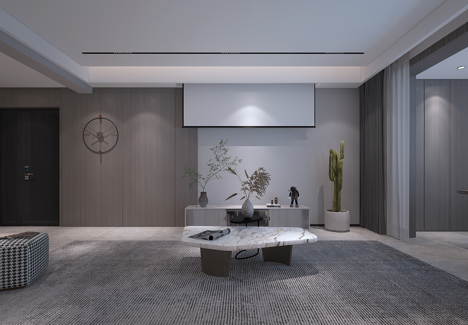設(shè)計(jì)理念:本案整體為現(xiàn)代風(fēng)格,大面積采用銀梨灰色木紋,時(shí)尚又不失沉穩(wěn),電視墻采用隱型門(mén),保證了墻面的完整性,過(guò)道由于梁過(guò)低,采用波浪的手法,弱化梁的存在感,也讓整個(gè)空間更具設(shè)計(jì)感。