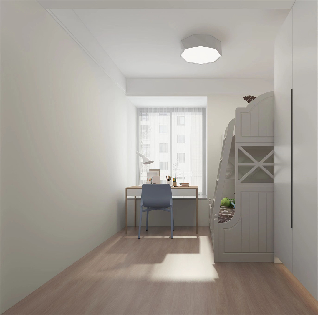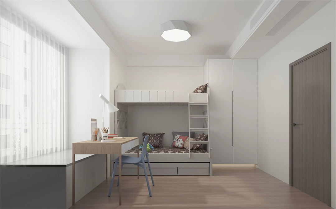 兒童房以上下鋪,將衣柜嵌入,增加功能的實(shí)用性。