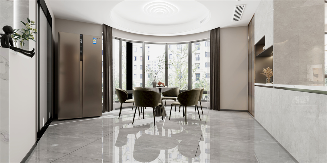 餐廳與客廳相連,讓自然光線籠罩整個(gè)室內(nèi),也讓客廳空間更加通透舒適。圓形的大理石餐桌是絕對(duì)的主角,圓角處理形成了流暢的弧線,緩和了直線條的冷硬,也避免了磕碰的概率。半開放式的餐邊柜滿足了收納需求,紅酒、潮玩、碗碟餐具……有序分列,各歸其處,彰顯著屋主的喜好和對(duì)美食的熱愛。