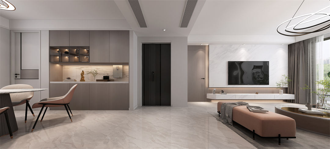 客餐廳以走廊吊頂做功能分區(qū),電視墻以護(hù)墻板打底,懸浮石材造型,搭配隱形門的設(shè)計(jì),讓空間整體性更加。