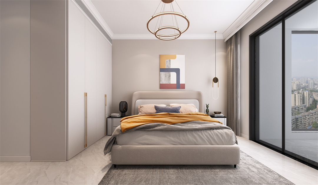 主臥以灰色為主,床頭內(nèi)嵌燈帶,再懸掛黃銅線性燈,為空間增添輕奢的質(zhì)感。