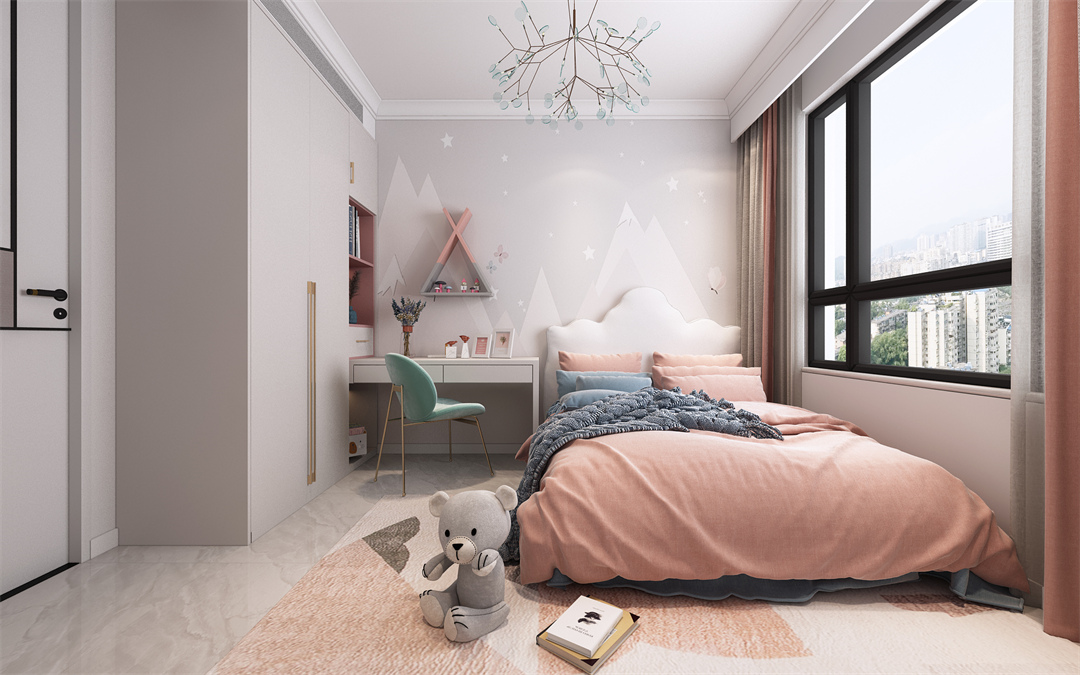 女兒房充滿夢(mèng)幻的色彩和元素,頂面水晶玻璃燈、墻面星星蝴蝶閃閃發(fā)光,充滿童真童趣。