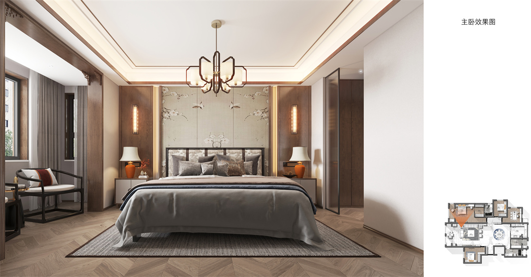 主臥背景墻以花鳥(niǎo)壁布結(jié)合護(hù)墻板做造型設(shè)計(jì),陽(yáng)臺(tái)融入空間,寫(xiě)意山河開(kāi)闊,象征業(yè)主對(duì)自然的憧憬和自由的向往。