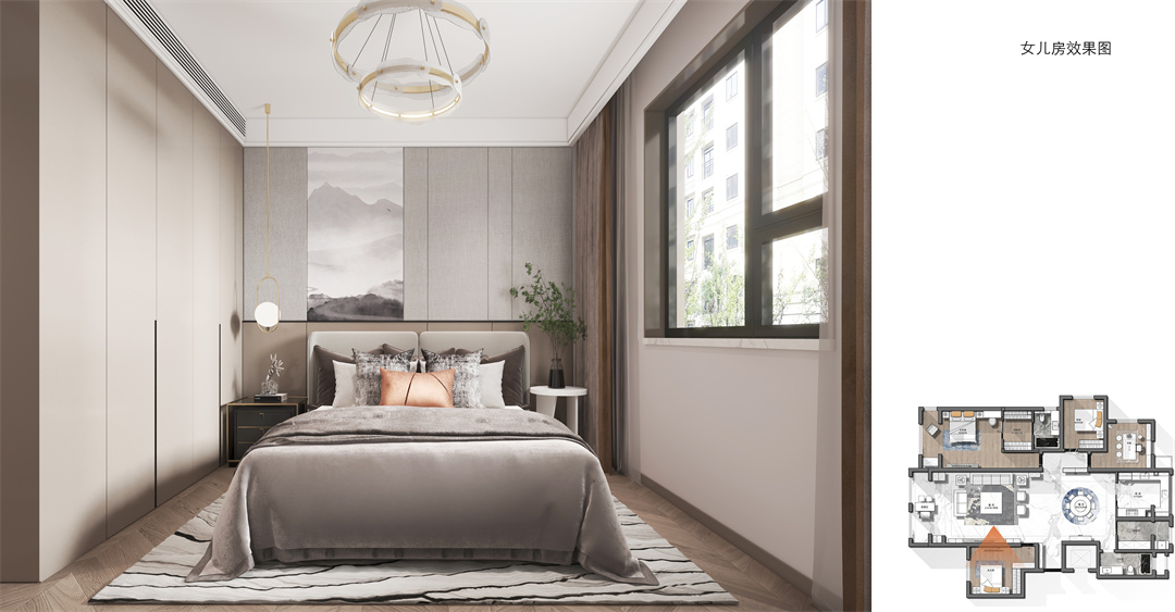 次臥以灰色為主,設(shè)計(jì)手法傾向于現(xiàn)代,簡(jiǎn)單意會(huì)空間,以舒適和功能并行。