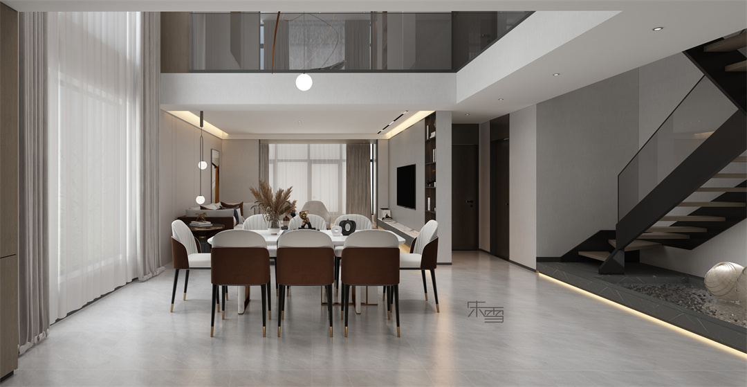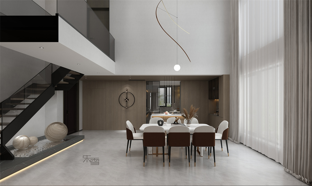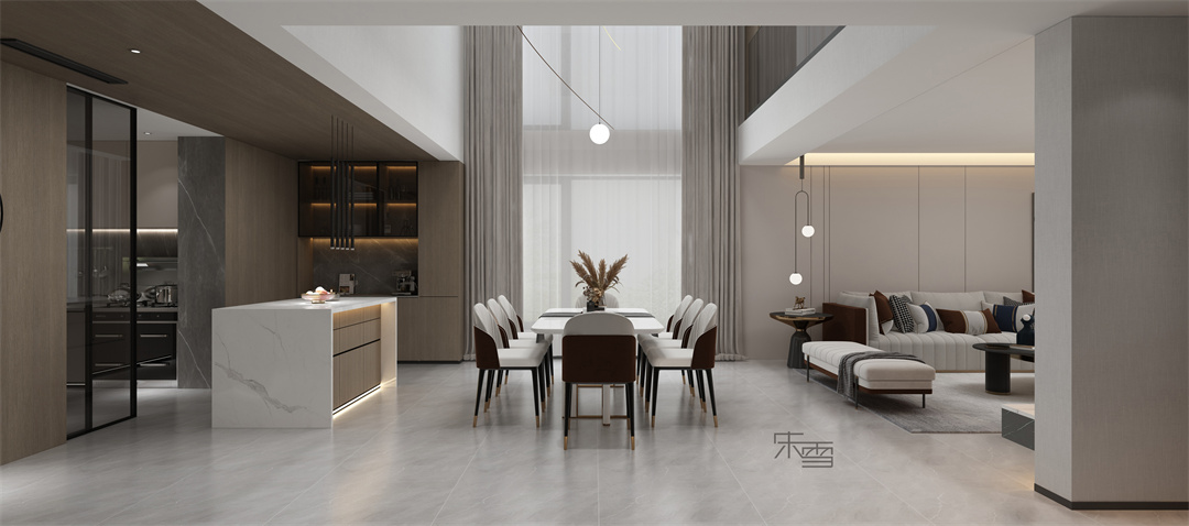 餐廳區(qū)域挑空,與廚房、島臺、餐廳形成聯(lián)動,塑造空間秩序的美感。
