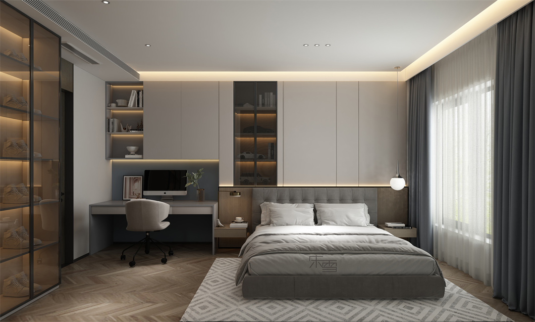 兒童房通過書桌連柜的設(shè)計(jì),將儲物形式與空間層次飽滿。在這里,設(shè)計(jì)師巧妙利用模擬柜門的形式做整墻的造型連接,讓空間保持完整和統(tǒng)一,提升居者的體驗(yàn)感。