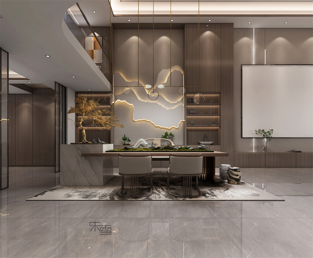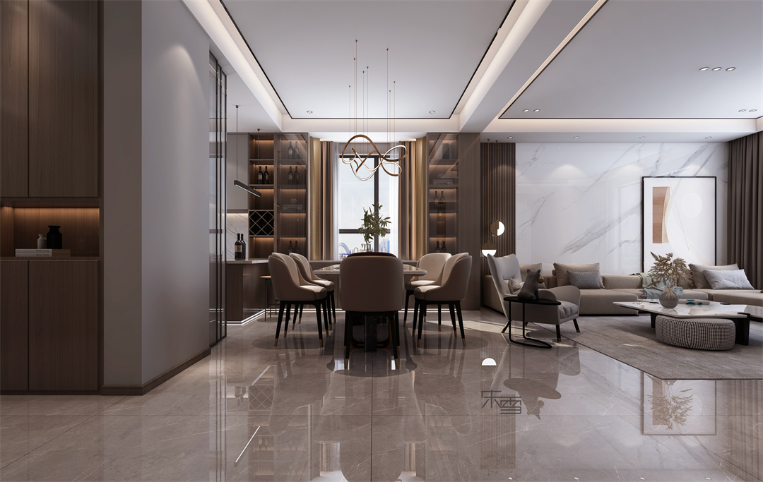 整個(gè)空間以胡桃色貫穿上下,暖黃色燈光點(diǎn)綴,來(lái)營(yíng)造輕奢的氛圍。