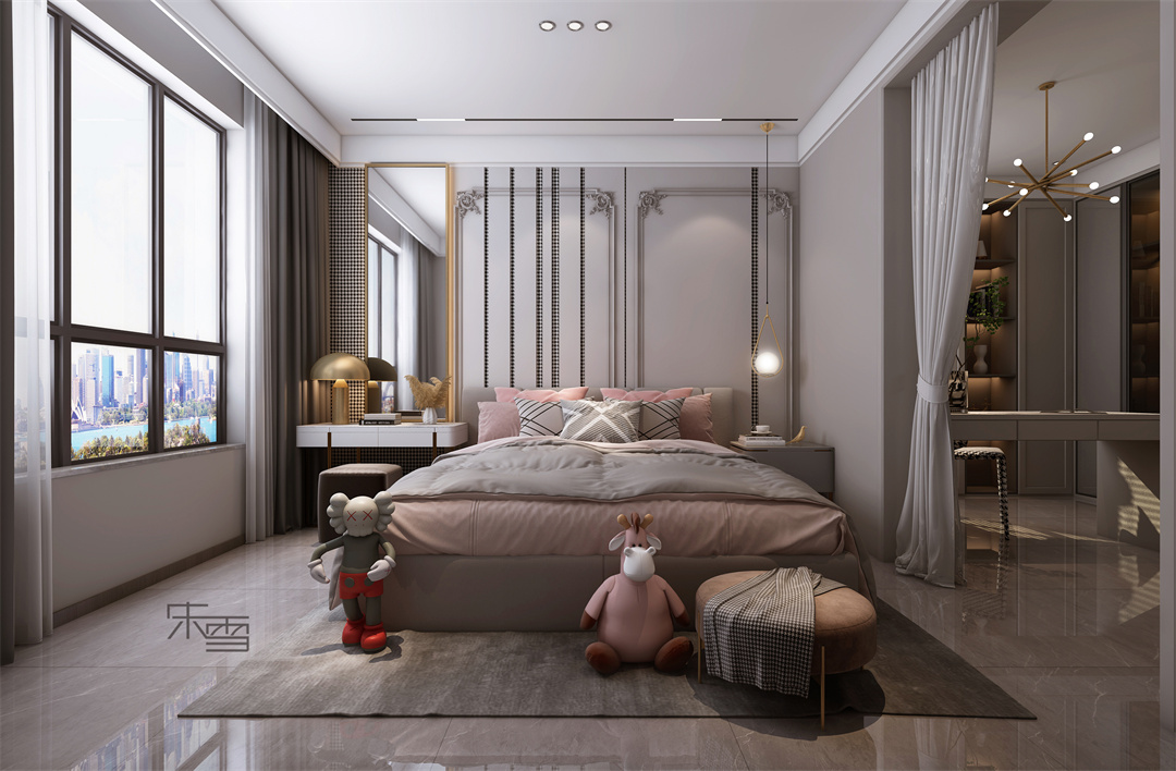 女兒房的床頭背景墻以石膏線做造型,粉色的床品使空間變得浪漫溫馨。