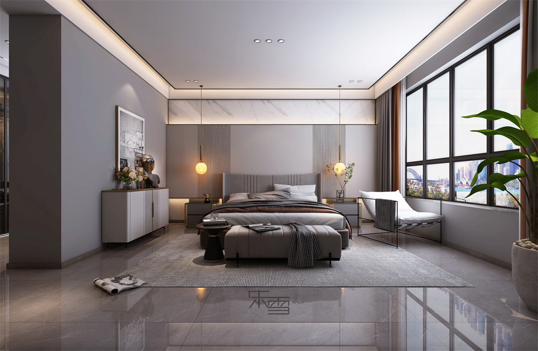 臥室造型多使用線條來(lái)裝飾,與整個(gè)環(huán)境相稱,既簡(jiǎn)單凝練又富于趣味。