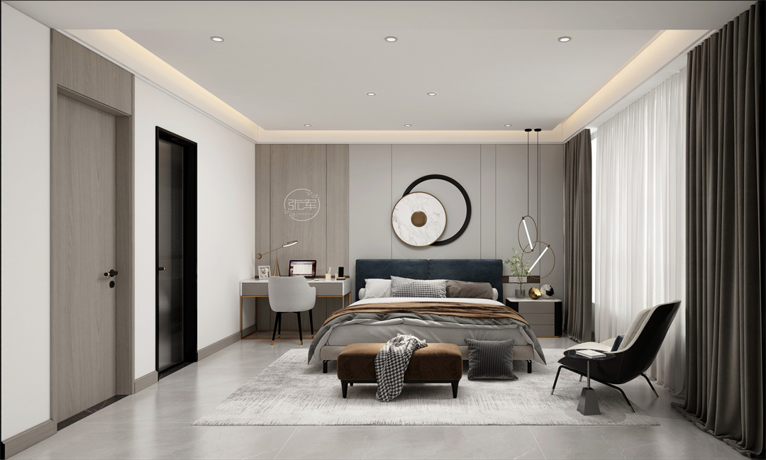 臥室雅致簡(jiǎn)約,精巧的燈具、雅致的掛畫(huà)、軟裝配飾等,使整個(gè)居室在現(xiàn)代氣息中滲透幾許中式風(fēng)韻。同時(shí)灰白顏色的運(yùn)用,讓空間告別沉悶,處處散發(fā)著簡(jiǎn)潔優(yōu)雅的層次之美。