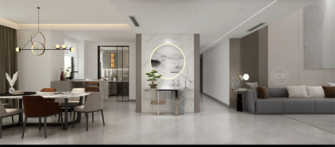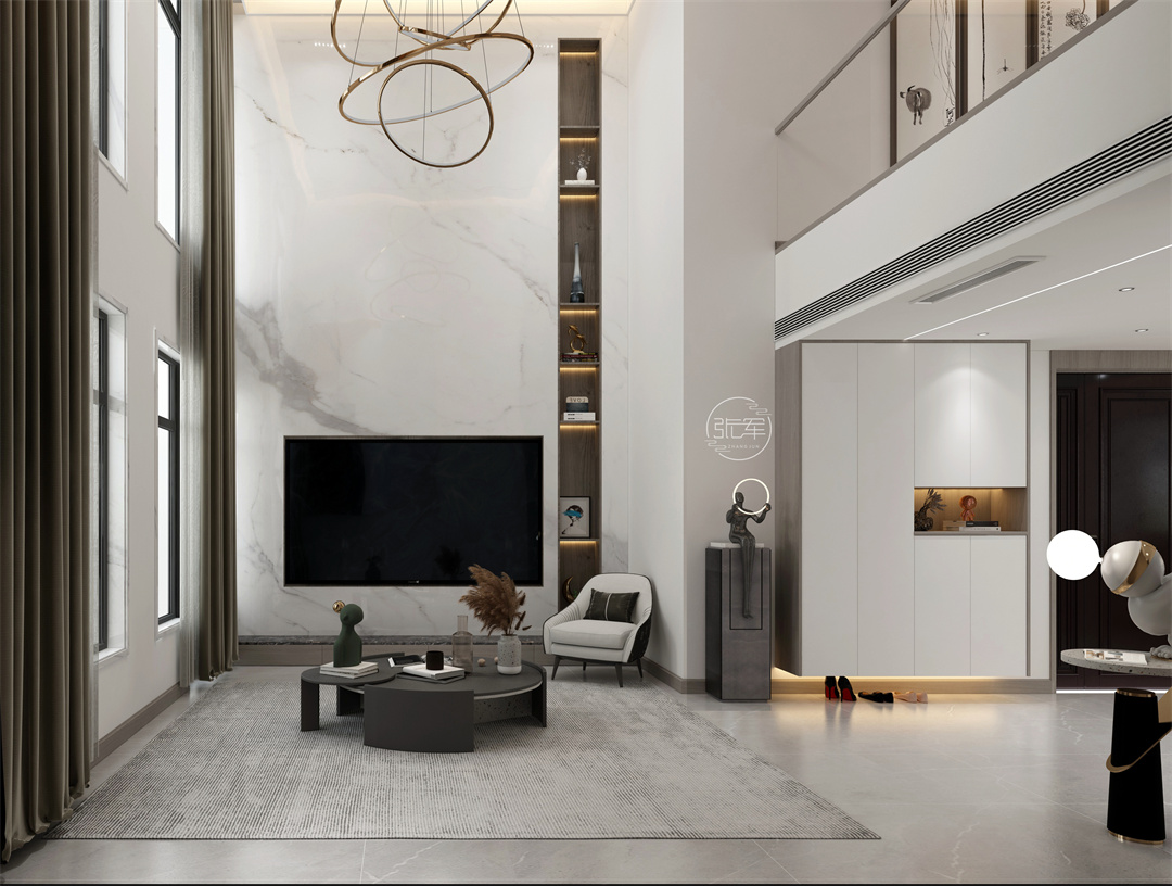 整案空間色調(diào)素凈雅致,灰白相間,黑白相生,讓空間充滿了寫(xiě)意水墨的氣質(zhì)。客廳電視墻一側(cè)挑高,石材通頂,氣勢(shì)恢宏。