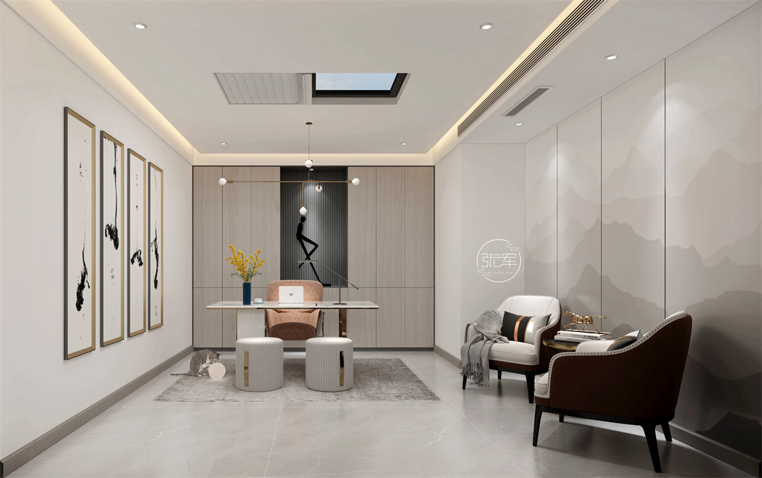 書(shū)房以留白為載體,渲染美的意境。背景墻干凈利落的線條,流暢的造型感,展現(xiàn)自然跡象的律動(dòng),讓空間美學(xué)暢意流淌。
