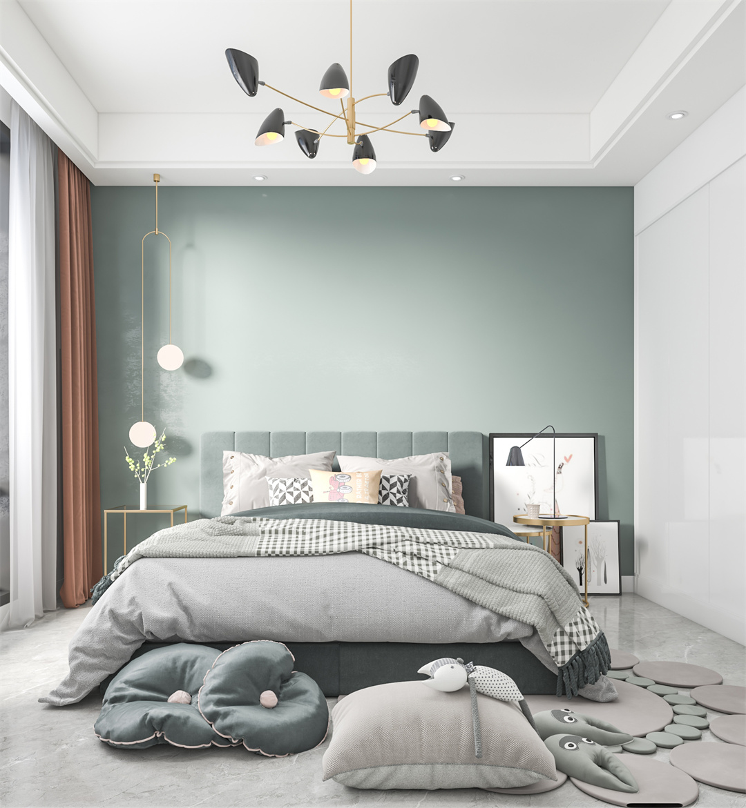 因?yàn)闃I(yè)主目前還沒有寶寶,所以兒童房以中性色渲染空間。淡淡的薄荷綠,柔和的銀灰色,還有可愛的裝飾,都讓整個(gè)空間充滿了甜蜜與童趣。