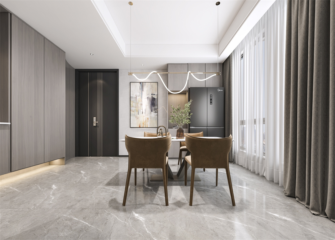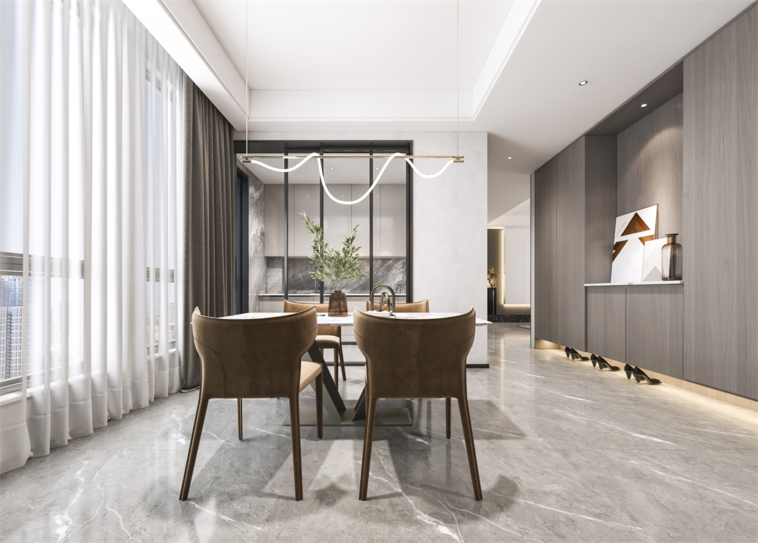 餐椅選用深棕色,與淺灰色做明暗光色對比,顯得空間更有質(zhì)感與深度。