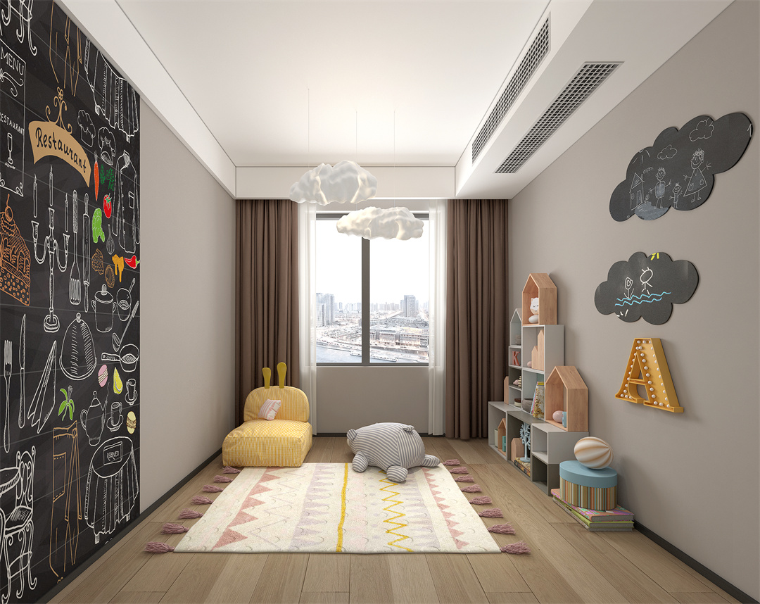 由于孩子還小,暫時(shí)將兒童房設(shè)計(jì)為親子房。這里是孩子玩耍的場(chǎng)所,也是童年與夢(mèng)起航的地方。