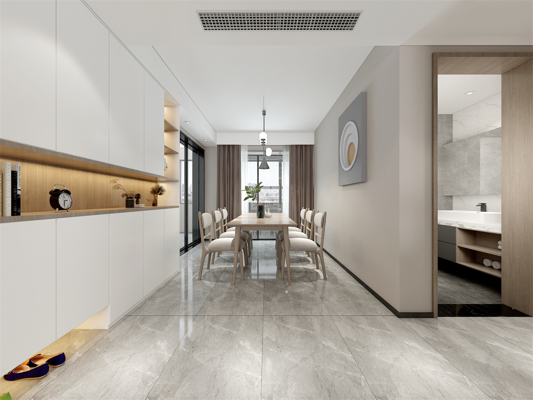 玄關(guān)聯(lián)動(dòng)廚房與餐廳,一整組的玄關(guān)柜滿足家人入戶的收納需求。餐廳是六人位餐桌椅陳設(shè),質(zhì)樸的原木色,簡(jiǎn)潔素雅的白,安靜怡人的空間,最適合家人用餐。