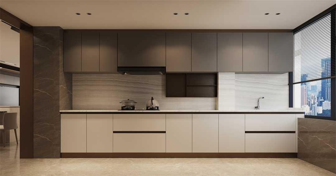 以中廚方式為主,洗切炒為一字型結(jié)構(gòu),背后一字排列為儲(chǔ)物結(jié)構(gòu),內(nèi)嵌冰箱隱藏進(jìn)去加上蒸烤電器及洗碗機(jī),里外各留有一個(gè)操作臺(tái)面最大化廚房?jī)?nèi)部空間利用率。