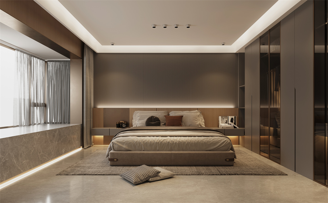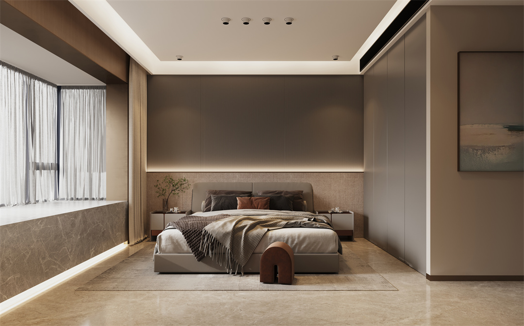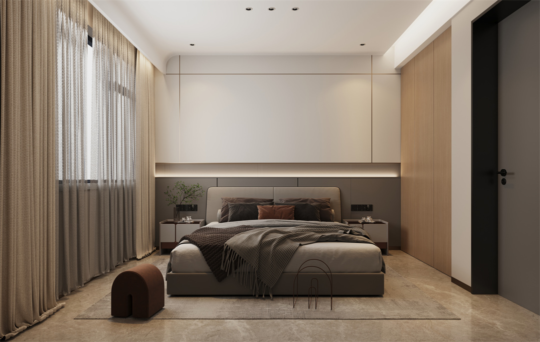 主臥設(shè)計(jì),灰色超細(xì)內(nèi)弧格柵床頭墻,結(jié)合原木色主色調(diào),紳士大氣中透漏著溫馨暖陽(yáng),套房的結(jié)構(gòu)