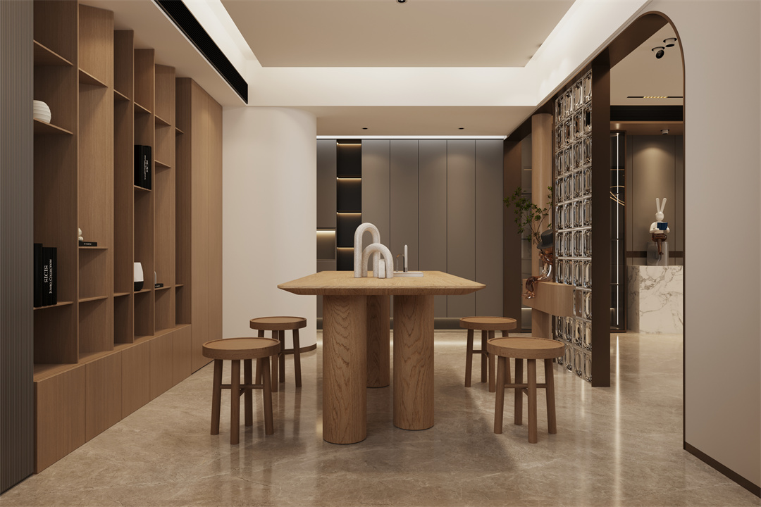 從側(cè)面看書房+餐廳,兩個(gè)空間互不打擾,地面通鋪灰色地磚讓空間更顯大氣。